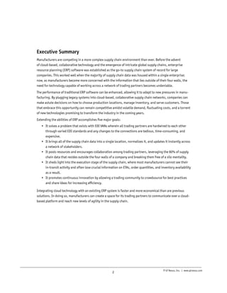 The document discusses five essential steps for manufacturers to enhance their supply chain performance by integrating ERP systems with cloud technology, addressing the complexities of modern global supply chains. It highlights the importance of collaboration among trading partners, real-time data sharing, and adapting to changing market dynamics to improve agility and competitiveness. Emphasizing continuous innovation, the document suggests that leveraging cloud capabilities allows manufacturers to resolve visibility issues, optimize processes, and maintain a robust supply chain in an evolving landscape.