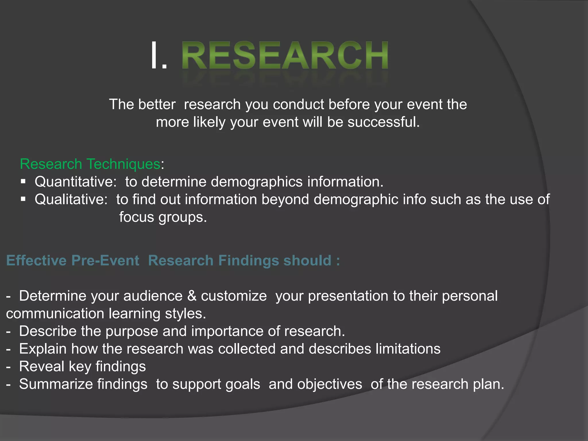 1. Research - Conduct quantitative and qualitative research to understand the audience and determine event goals and objectives. This includes determining demographics, focus groups, and SWOT analysis.