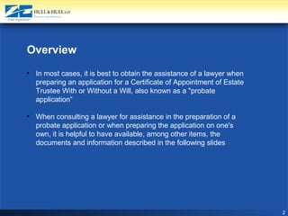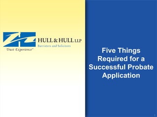 This document outlines five things that are required for a successful probate application: 1) the original last will and testament, 2) an affidavit of execution sworn by a witness, 3) complete details of the estate's assets and their values, 4) proof of the death, such as an original death certificate, and 5) probate fees or estate administration taxes that need to be filed with the application. Consulting a lawyer is also recommended to properly prepare the probate application.