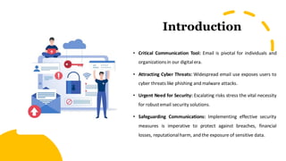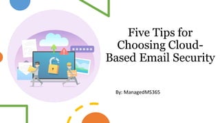 The document outlines five essential tips for choosing cloud-based email security, emphasizing the importance of advanced threat detection, strong encryption protocols, user authentication, regular security audits, and seamless integration with a cloud security ecosystem. It highlights the rising cyber threats to email communications and the necessity for organizations to implement robust security measures to protect sensitive information. Ultimately, investing in comprehensive email security solutions is crucial for safeguarding communications against breaches and financial losses.