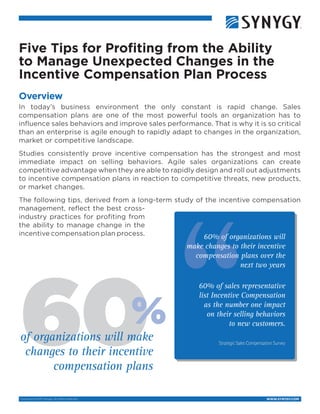 The document provides five tips for organizations to profit from their ability to manage unexpected changes to incentive compensation plans. The tips are to: 1) design processes to anticipate potential changes, 2) create awareness of change timelines and impacts, 3) conduct advance planning for processing cycles, 4) parameterize plans to reduce reconfiguration needs during changes, and 5) automate processes to free up time for staff to handle exceptions and changes. Following these tips helps organizations adapt compensation plans in response to business needs and competitive threats.