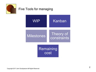 The document discusses five essential tools for project management, including backlog management, kanban, milestones, theory of constraints, and cost management. It emphasizes the importance of organizing tasks, managing work-in-progress effectively, and planning towards valuable milestones while highlighting the challenges of merging tasks and maintaining quality. Additionally, it covers cost management strategies to ensure value delivery aligns with project expenditures.