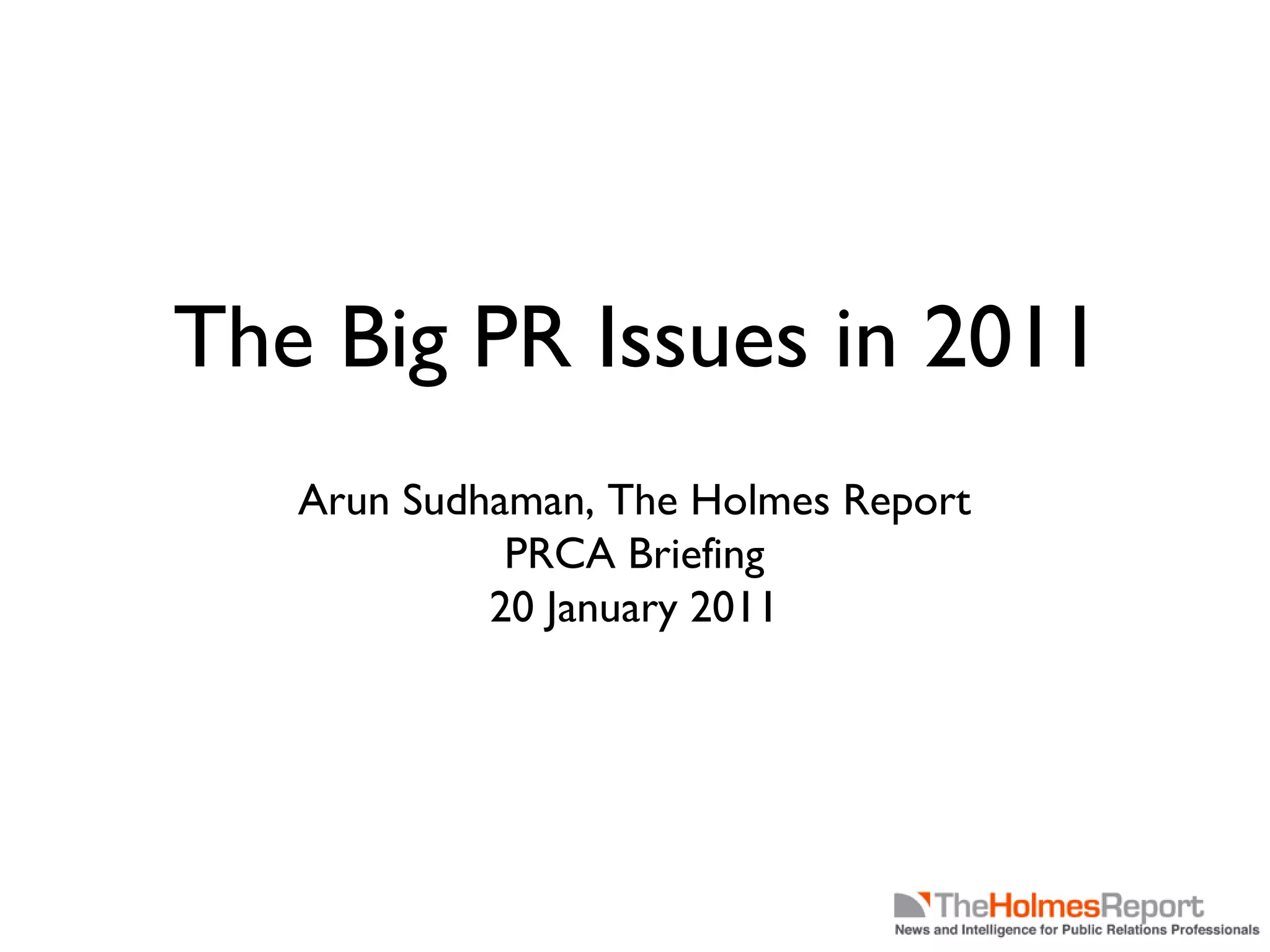 The document discusses the major issues facing the public relations industry in 2011. It notes that while global PR saw modest growth in 2010, the UK market was hit hard by declines in the public sector. The top concerns for the UK PR industry were the economic conditions, attracting talent, and competition from other marketing disciplines. Five key issues to watch included the continued rise of digital PR, the collision of marketing and PR fueled by social media, managing crises exacerbated by social media, tapping emerging international markets, and heightened focus on ethics in public relations.