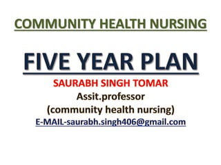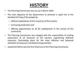 The document outlines the history and functions of the Planning Commission of India, established in 1950 to promote economic growth and improve living standards through resource assessment and planning. It details various five-year plans from 1951 to 2016, addressing healthcare initiatives, economic strategies, and significant health programs introduced over the decades. Key objectives included improving healthcare access, controlling communicable diseases, and enhancing rural healthcare services, all aimed at achieving a healthier population and sustainable development.
