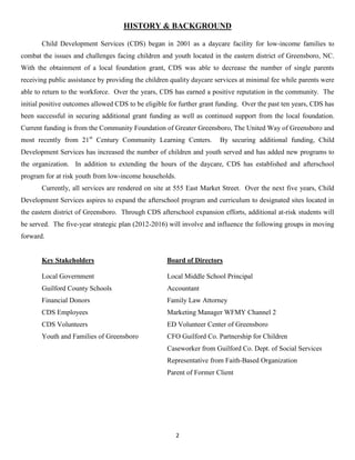 The document provides a strategic plan for Child Development Services (CDS) for 2012-2016. CDS began in 2001 providing daycare and afterschool programs for low-income families. The plan aims to address 6 strategic issues: acquiring additional funding, increasing accessibility of services, developing a culturally responsive curriculum, securing consistent volunteers, overcoming negative neighborhood influences, and empowering parental involvement. The plan outlines 2 goals: 1) Increasing funding through individual donors, volunteers, and grants and 2) Increasing accessibility of afterschool programs through new community partnerships, marketing, and establishing programs in schools and housing communities. Key actions include developing a donor database, applying for grants, attending community meetings, and establishing referral systems with local organizations.