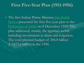 The document outlines India's successive five-year plans from 1951-1956 to 2012-2017. The first plan focused on irrigation, energy and agriculture. It established 5 IITs and the UGC. The second plan emphasized industry and heavy industry, establishing 5 steel mills. Later plans stressed agriculture, poverty alleviation, employment, education, health, women/child development and the environment. Plans also aimed to accelerate GDP growth to fulfill targets like doubling income and reducing poverty, malnutrition, and illiteracy.