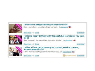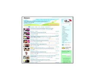 This document provides tips for making money on Fiverr by selling digital services and skills as "gigs" for $5 each. It outlines how to sign up, identify skills to sell, create captivating gig listings, provide good customer service, upgrade gigs for higher profits, and create new gigs repeatedly to earn more. The key is developing unique, high-quality gigs in your areas of expertise to attract buyers, meet deadlines, and gain positive reviews that bring more customers and opportunities to increase earnings on Fiverr over time.