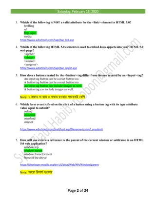 The document contains HTML5 test questions with multiple-choice answers, covering various aspects of HTML5 elements, attributes, and events. It includes questions about table creation, element attributes, JavaScript functions, and form handling. Each question is linked to relevant resources for further information.