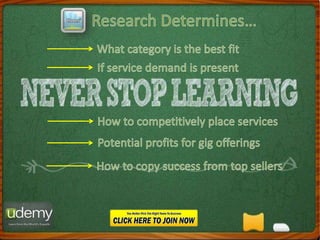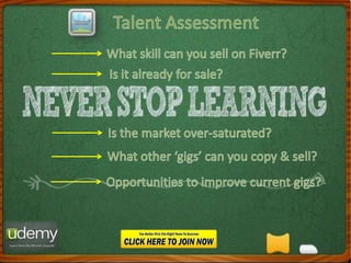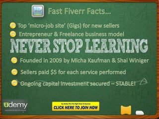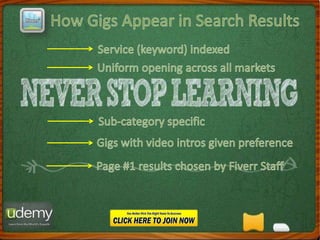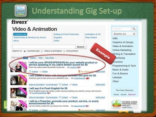 The document outlines how earning revenue on Fiverr is displayed on the payments page, including categories, sub-categories, keyword search, and gig descriptions. It emphasizes the functionality of the payment interface. Additionally, it mentions aspects such as the order button and service ratings.