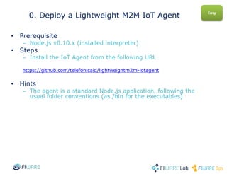 This document provides instructions for 8 exercises involving deploying and using an IoT Agent to connect IoT devices to the FIWARE Context Broker. The exercises cover tasks like deploying an IoT Agent, provisioning devices, registering devices using the LWM2M protocol, retrieving and updating sensor data, detecting new data providers, customizing attribute mappings, and provisioning device groups. Contact information is provided for getting help with the exercises.