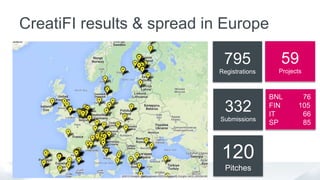 The document summarizes results from selected FIWARE projects, detailing various open calls such as Creatifi, Fi-C3, and Fabulous, along with their respective project submissions and pitches. It lists innovative projects across multiple domains, including digital media, health care, smart cities, and 3D printing, highlighting their objectives and key functionalities. Contact information for inquiries and future open calls is also provided.