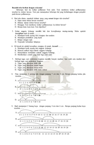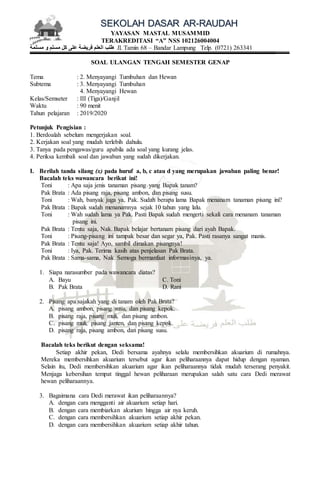 Dokumen tersebut berisi soal ujian tengah semester untuk kelas 3 semester ganjil tentang tema menyayangi tumbuhan dan hewan. Soal berupa pilihan ganda dan esai pendek yang mencakup materi tentang wawancara, cara merawat tumbuhan dan hewan peliharaan, serta pecahan dan bilangan.