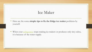 This document provides tips for fixing common ice maker problems in a refrigerator. It suggests checking the water supply tube for blockages from ice or debris as this is often the cause of small or no ice production. It also recommends removing detachable parts and allowing them to warm before cleaning to avoid cracking. Turning off the refrigerator temperature before repairs is also advised. Specific troubleshooting steps include melting ice in the inlet tube, checking for water flow, and potentially replacing the inlet valve. Professional servicing is recommended if the DIY fixes do not resolve the issue.