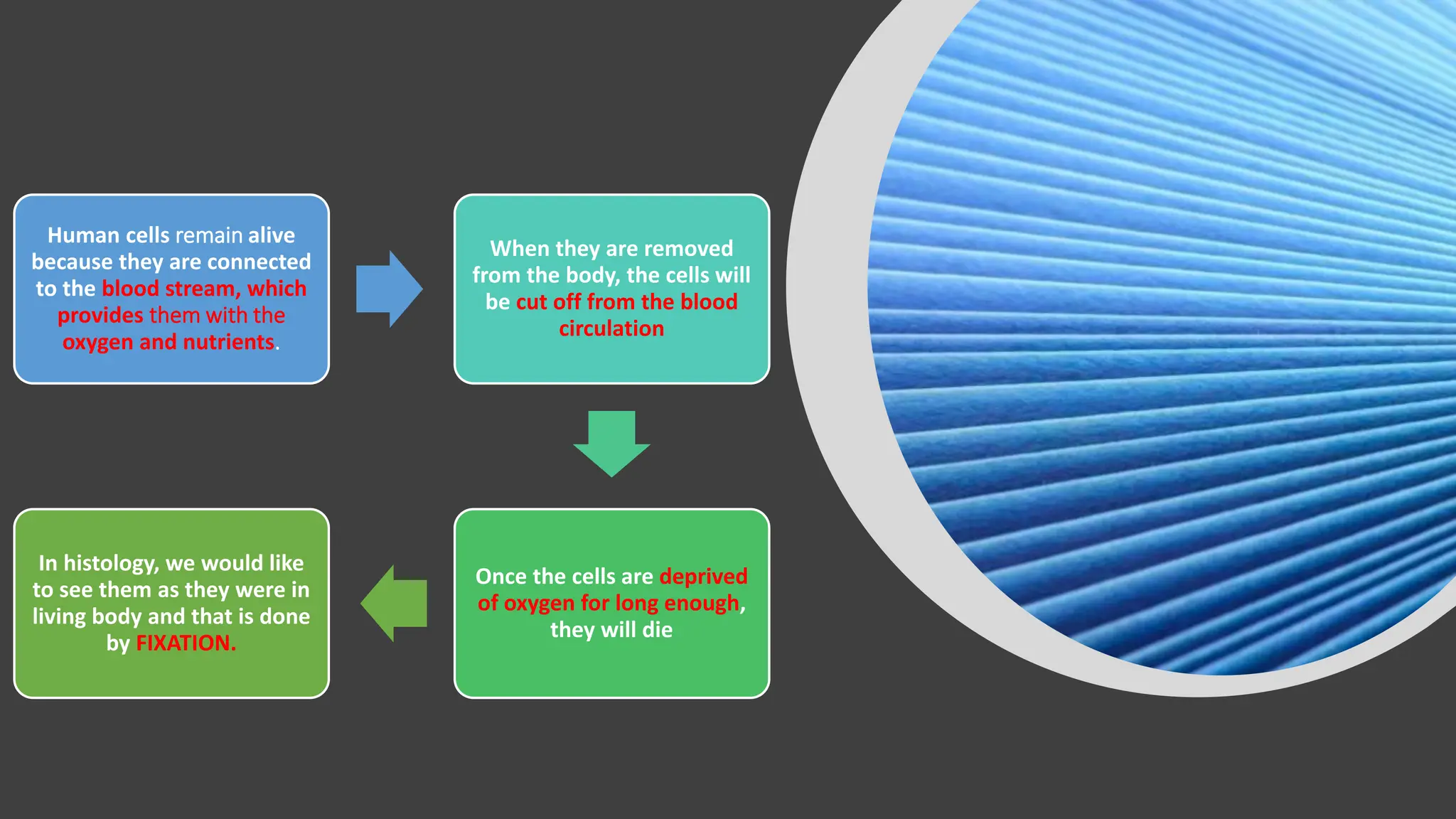 This document discusses various types of fixatives used to preserve cell and tissue structure. It begins by explaining how living cells require oxygen and nutrients from blood circulation, and will die when cut off from this supply. Fixation is needed to preserve tissues as they were in life for histological examination. Various fixatives are then described, including physical, chemical, simple, compound, dehydrant, coagulant, cross-linking, and osmium tetroxide fixatives. The ideal properties and mechanisms of several common fixatives like formaldehyde, glutaraldehyde, picric acid, acetic acid, and mercuric chloride are also summarized.