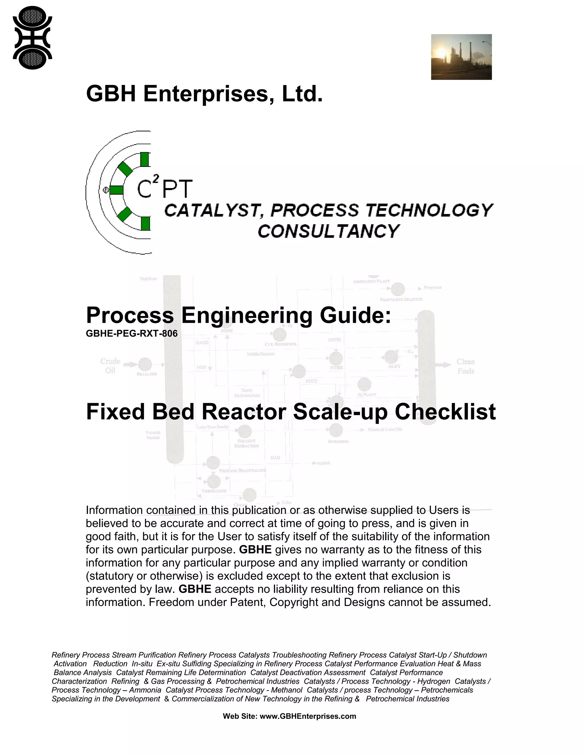 The document is a process engineering guide by GBH Enterprises that outlines a checklist for scaling up fixed bed reactors, addressing stages and potential issues from design to full-scale implementation. It emphasizes the importance of preliminary laboratory tests and the potential need for pilot or sidestream units to identify critical problems early in the design process. The guide is aimed at process engineers and covers relevant factors that need to be considered during reactor development without focusing on catalyst specifics.