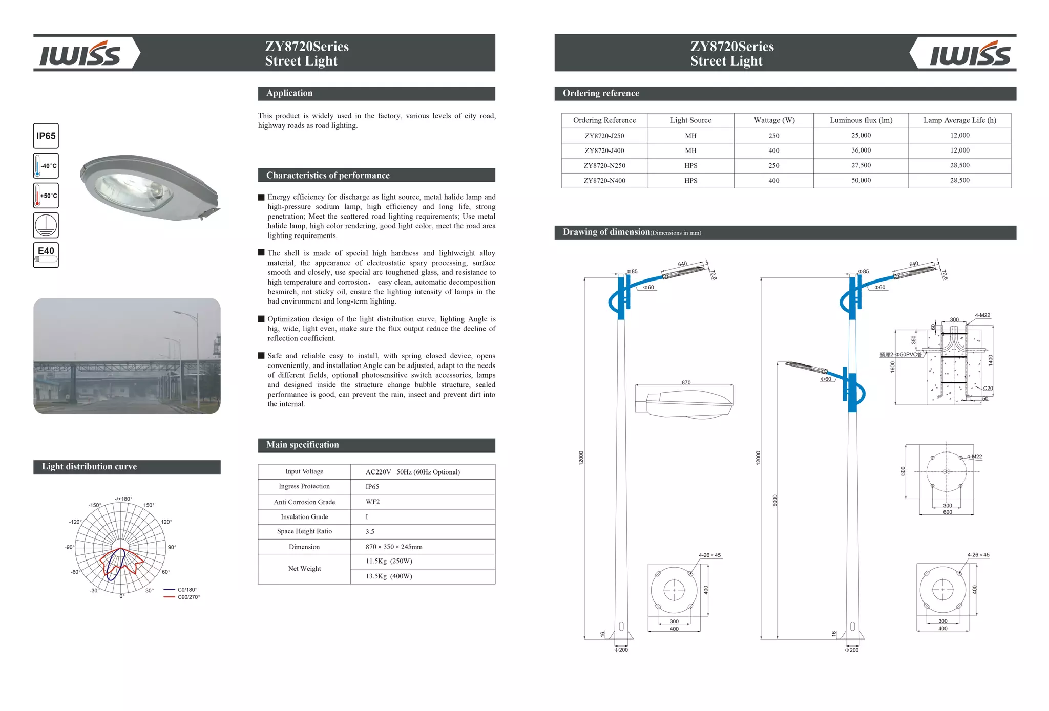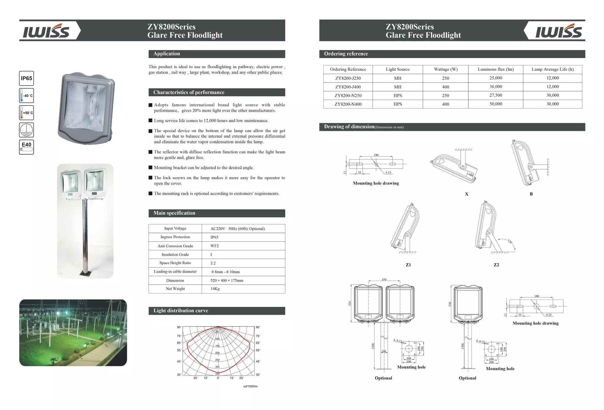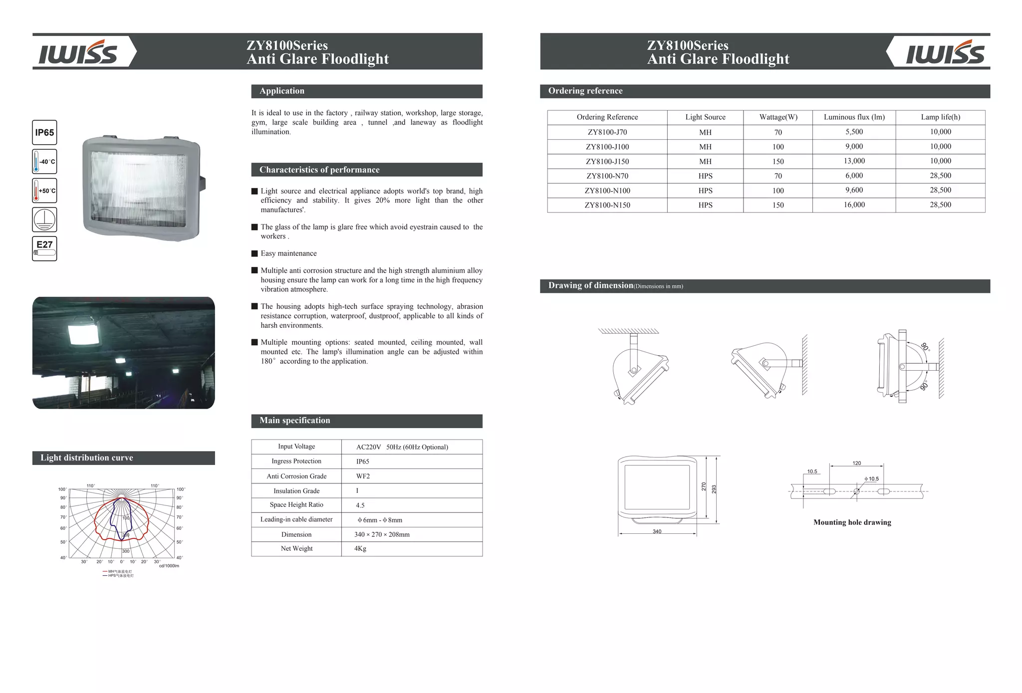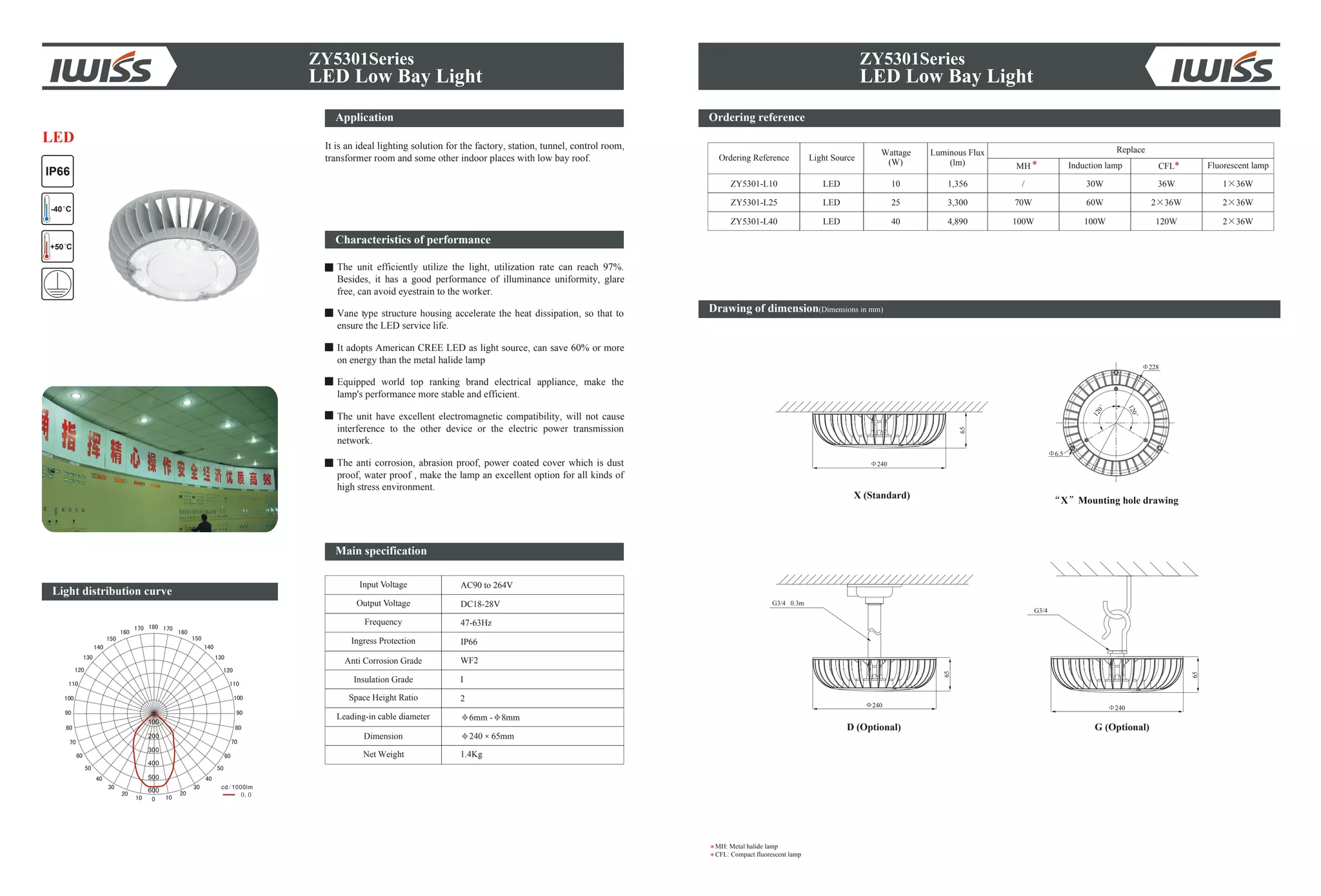 This document provides product information for multiple series of lighting products, including LED lights, spotlights, floodlights, and low bay lights. For each series, it lists ordering references correlated to light source and wattage. It also provides dimensions, specifications, applications, characteristics, and performance details. Technical specifications include ingress protection ratings, operating temperatures, voltage inputs, weight, and more. Applications listed include indoor uses like factories, warehouses, and outdoor uses like construction sites.