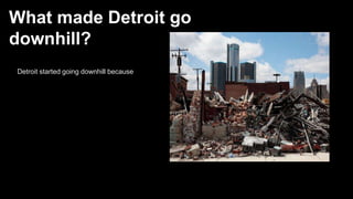 The document discusses reasons for Detroit's decline and proposes solutions to fix the city. It suggests Detroit went downhill due to a lack of jobs and livable environment. The document recommends refurbishing salvageable buildings, demolishing unsalvageable structures, and rebuilding the city by providing housing to revitalize Detroit.