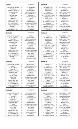 This document contains schedules for multiple dates listing soccer/football matches between different teams. Each entry lists two teams separated by "c." indicating they will play each other on that date. The schedules are broken into pairs of dates and include matches for 15 different dates ranging from February 15, 2015 to July 19, 2015.
