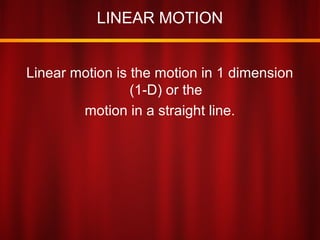 This document provides an overview of linear motion concepts including distance, displacement, speed, velocity, acceleration, and equations related to uniform velocity and uniform acceleration. Key points include: