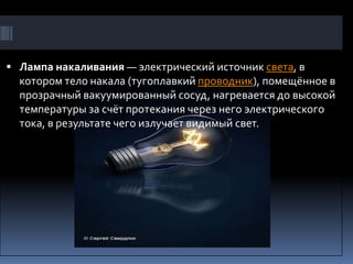 Лампа накаливания представляет собой электрический источник света, где тело накала нагревается током в вакуумированном сосуде. Первый разработчик лампы, Александр Лодыгин, привлек внимание к источникам света, хотя принцип накаливания был известен ранее. Современные лампы используют спираль из вольфрама и имеют свои преимущества и недостатки, включая низкую стоимость и хрупкость.