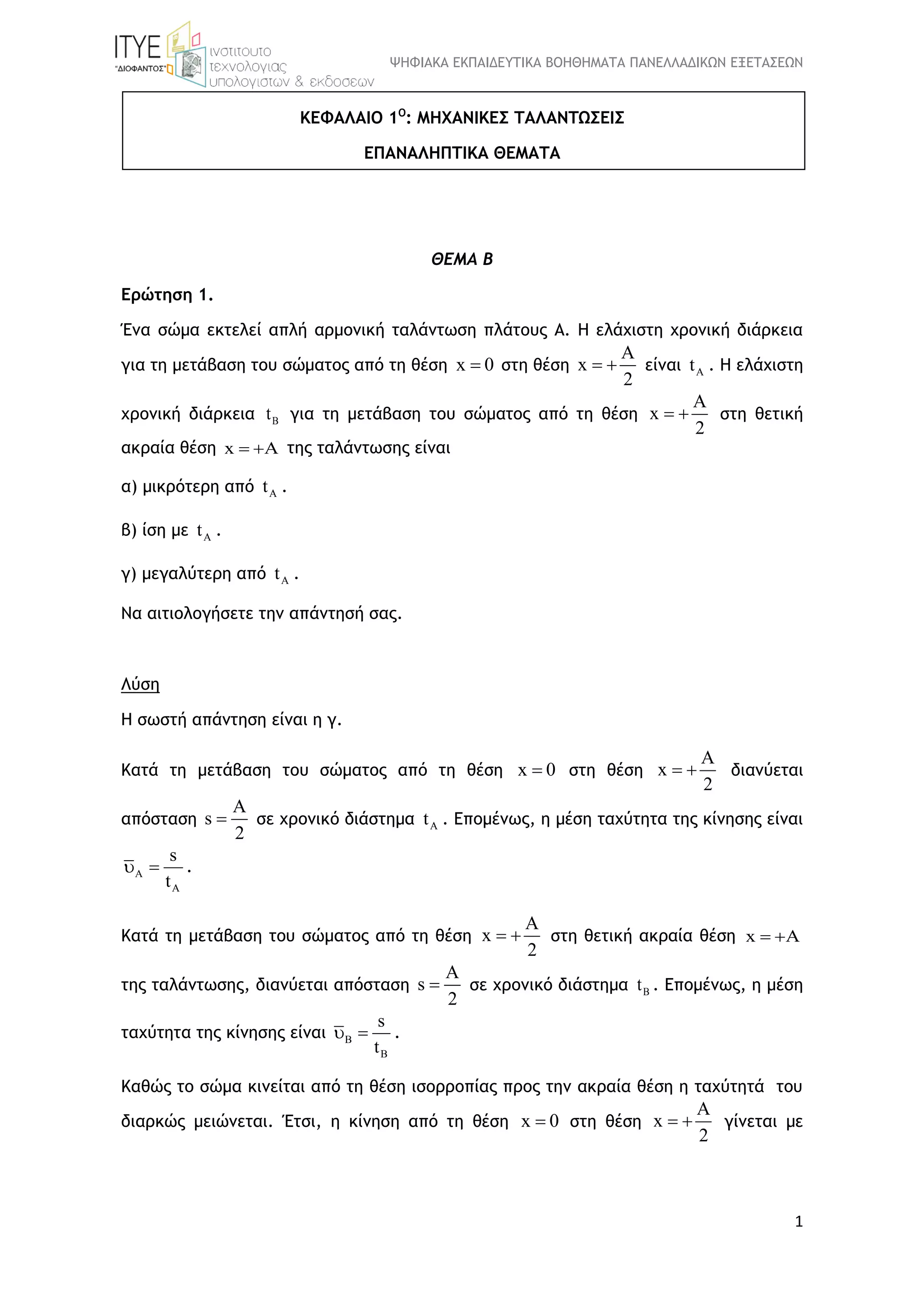 Η ταχύτητα σε μια ταλάντωση μηδενίζεται κάθε