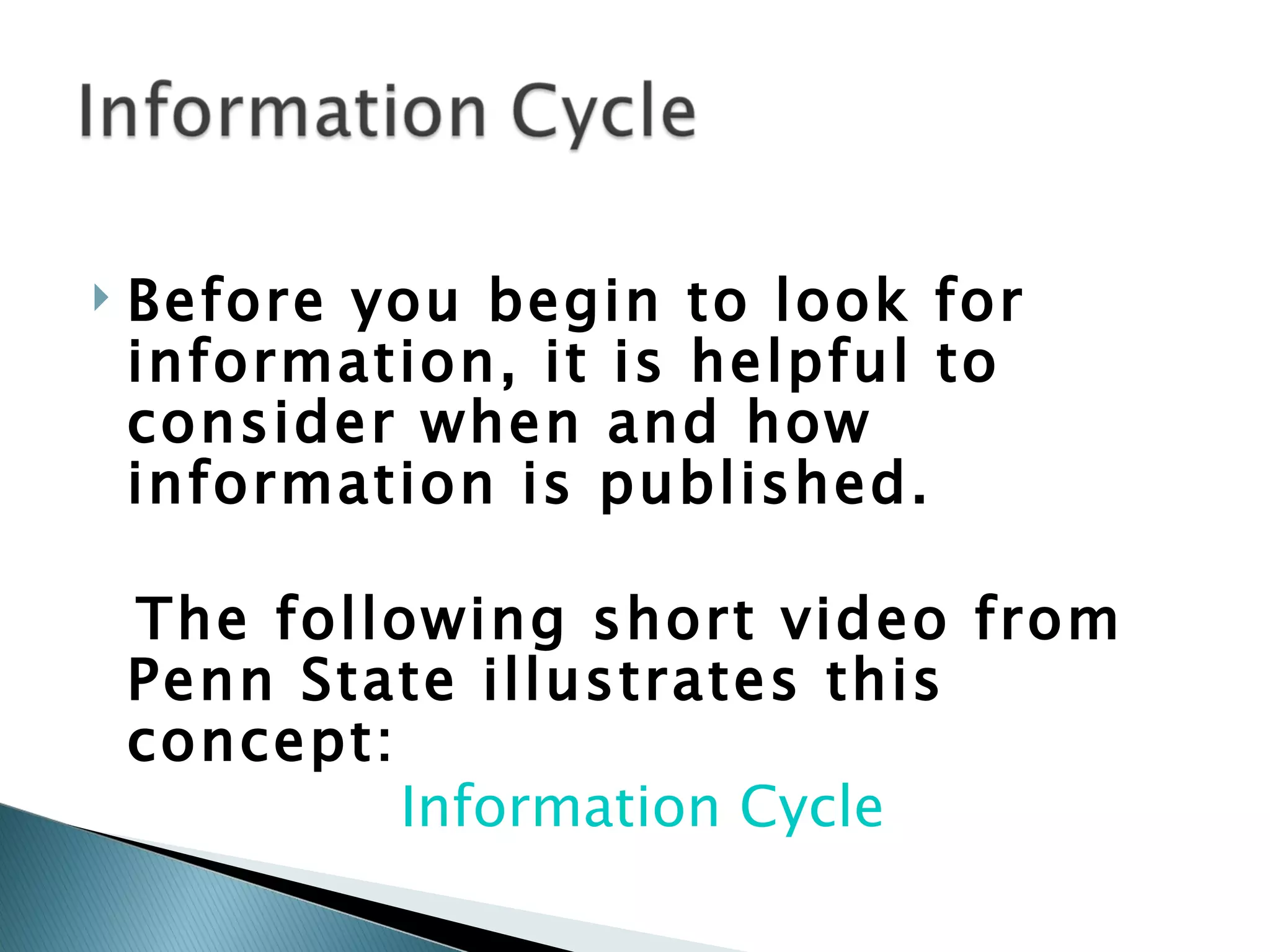 The document discusses how information is published over time after an event occurs and provides examples to illustrate the information cycle. It then outlines resources available to students at FKCC such as the library catalog, databases, computers, and assistance from librarians to help with research and selecting a topic. The document encourages students to use databases to help choose a topic and find articles, and to evaluate sources found online.