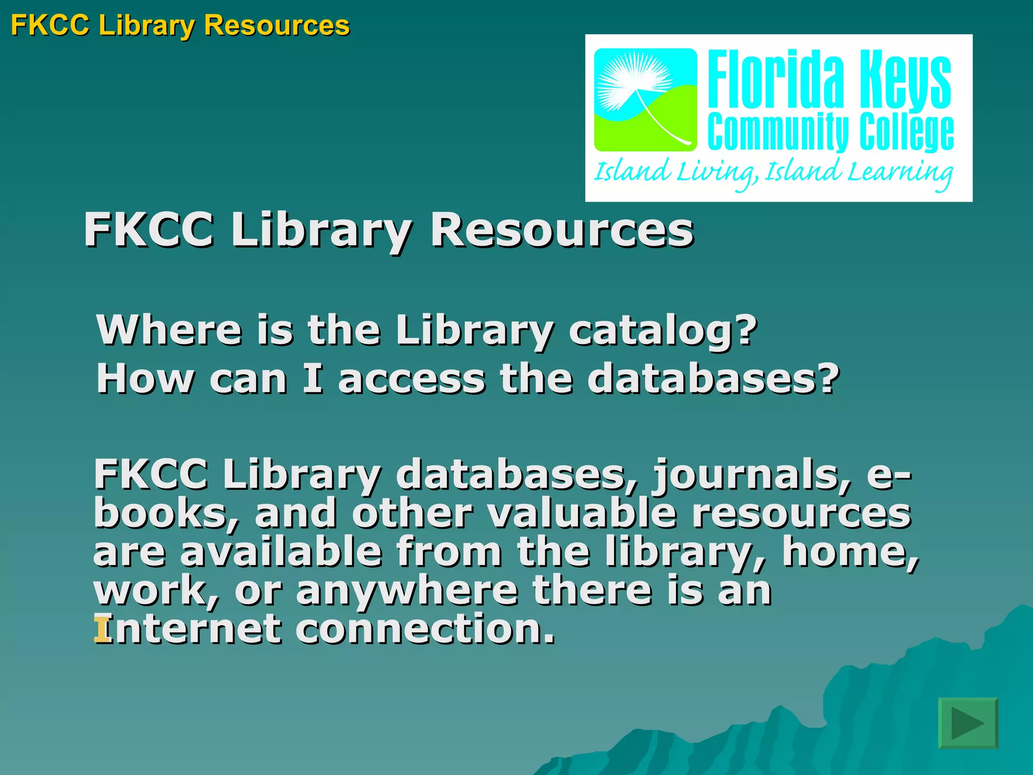 The document provides information about the library resources available through FKCC Library, including accessing the library catalog to search for books, e-books, audiovisual materials and more. It also describes how students can access over 85 online databases through the library to search academic journals, newspapers and other publications from anywhere with an internet connection. Contact information is given to visit the library website or email and call the library for additional help.