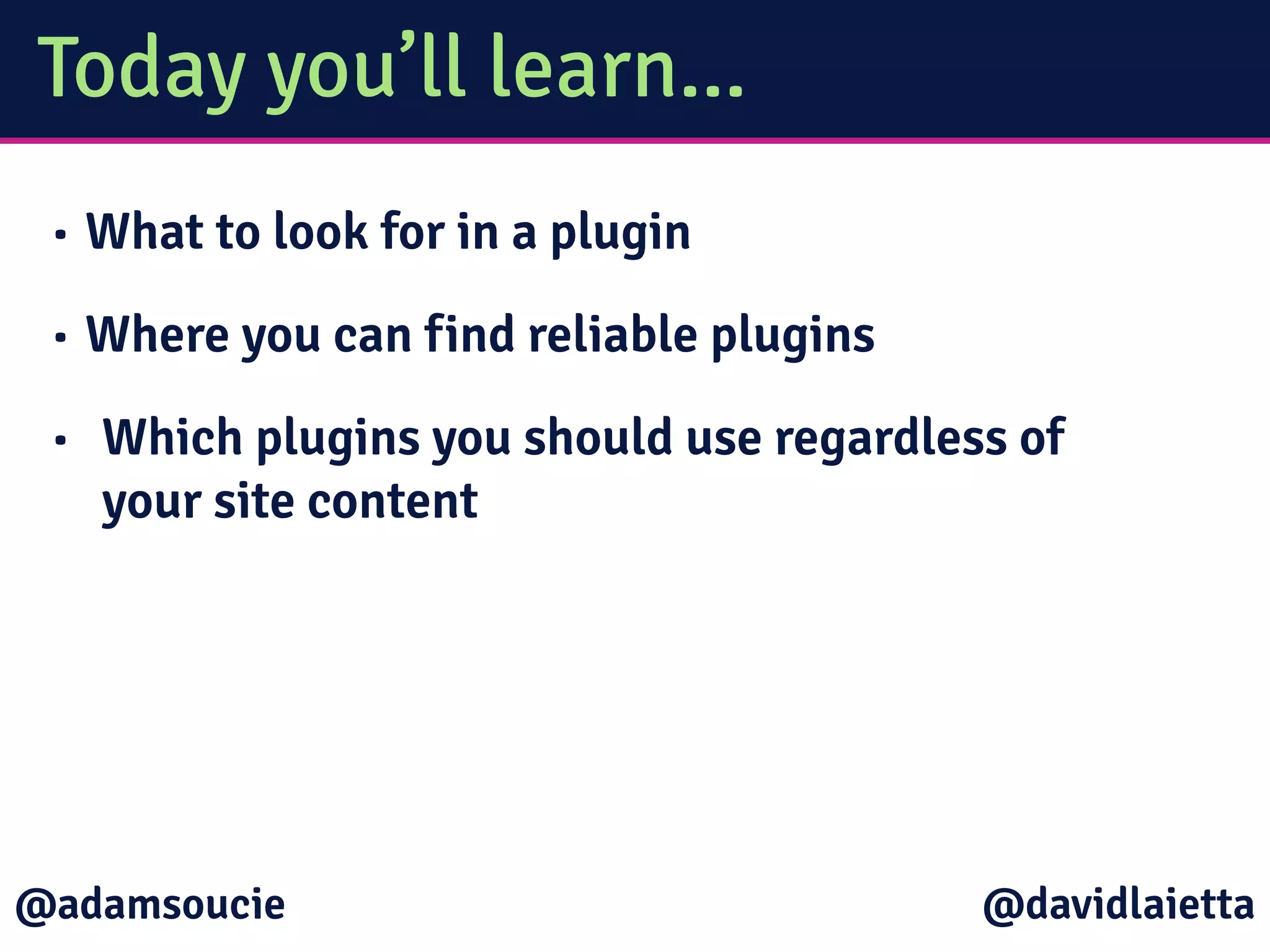 The document provides a guide on finding the best WordPress plugins, focusing on important criteria such as active support, functionality, and ease of installation and setup. It emphasizes using plugins from trusted sources, recommending specific plugins like WordPress SEO and Gravity Forms. The authors encourage users to avoid plugins from unreliable sources and to prefer those that are simple and effective.
