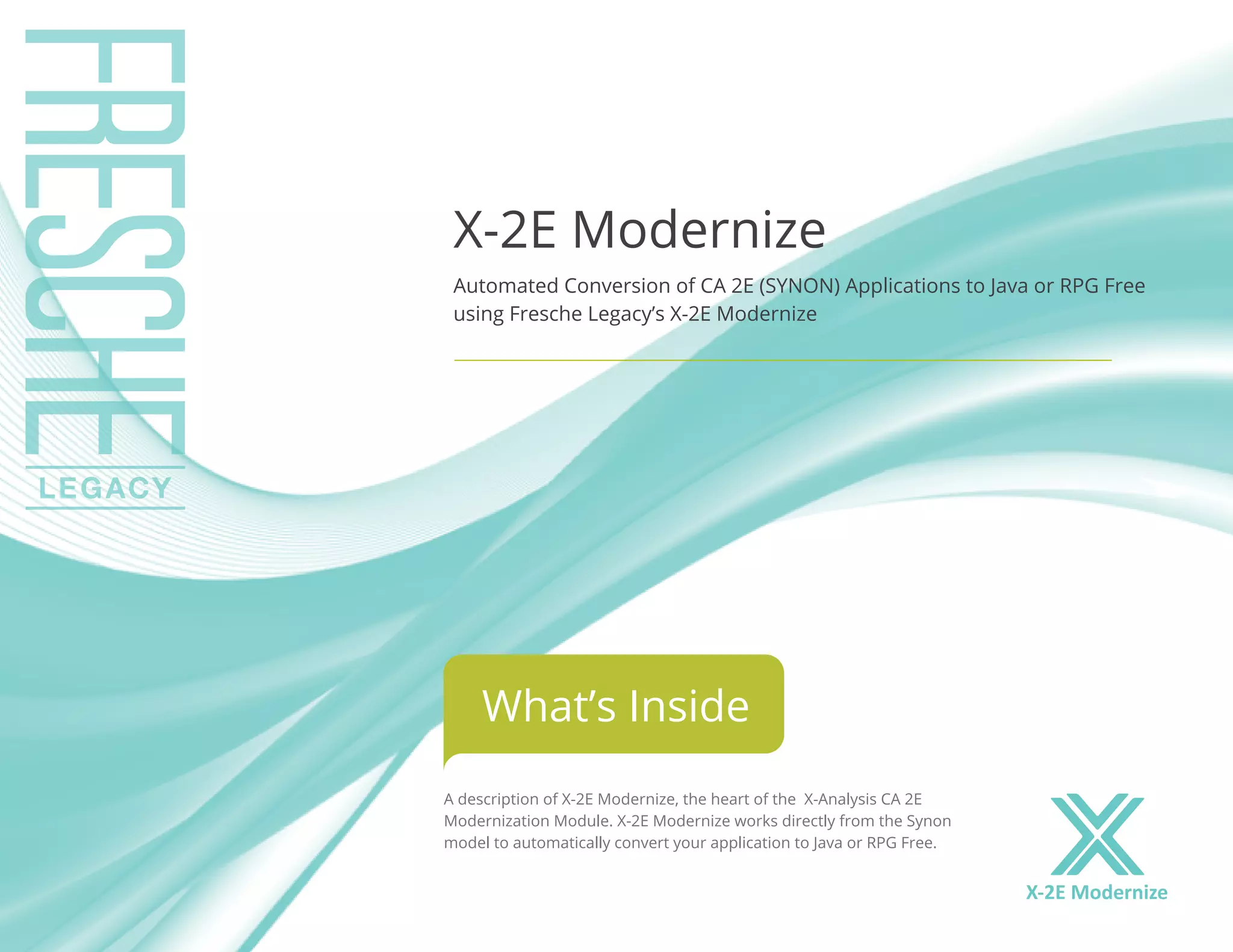 X-2E Modernize is software that automatically converts applications developed using CA 2E (Synon) to Java or RPG Free by working directly from the Synon model. It recovers the design elements from the Synon model, including screens, functions, data layers, business logic, and action diagrams. It then generates code for the converted application based on these recovered designs, following a modern MVC architecture pattern. The software analyzes the Synon application, extracts the essential information without retaining unnecessary or unrecognizable code, and restructures it into a maintainable application with a modern design.