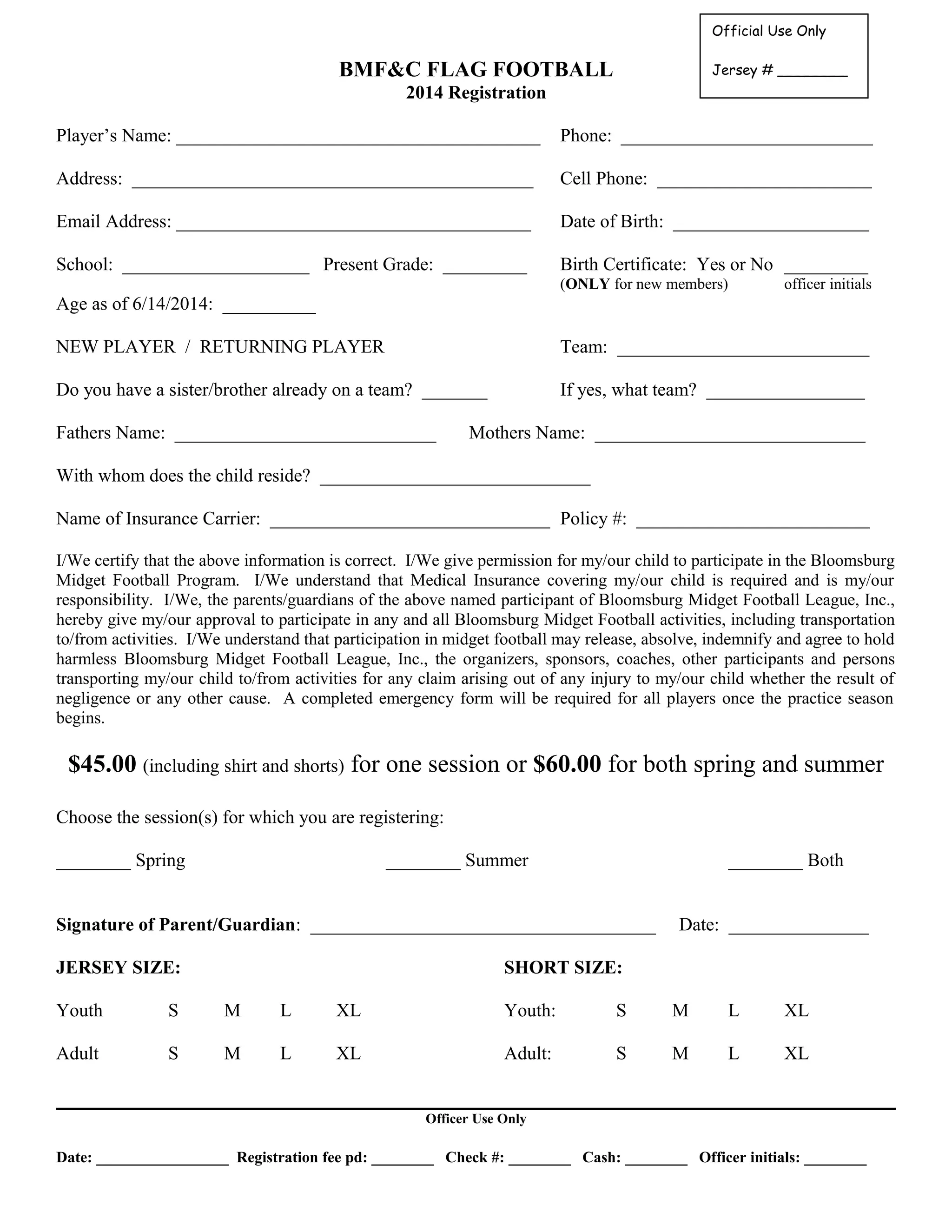 This document contains a registration form for a flag football league. It collects information such as the player's name, contact details, age, school, insurance information, and permission from parents to participate. Players can register for either the spring session, summer session, or both, and payment is required upon registration.