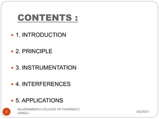 Flame photometry is a technique used to determine the concentration of certain metal ions in a sample by measuring the intensity of light emitted from their atoms when excited in a flame. The sample is nebulized and introduced into a flame, where the metal atoms are excited and emit light of characteristic wavelengths. This emitted light is separated into its component wavelengths by a monochromator and measured with a detector, allowing quantification of metal ion concentrations in the original sample. Potential sources of interference include overlap of emission lines from different elements and effects of high ion concentrations on atom excitation.