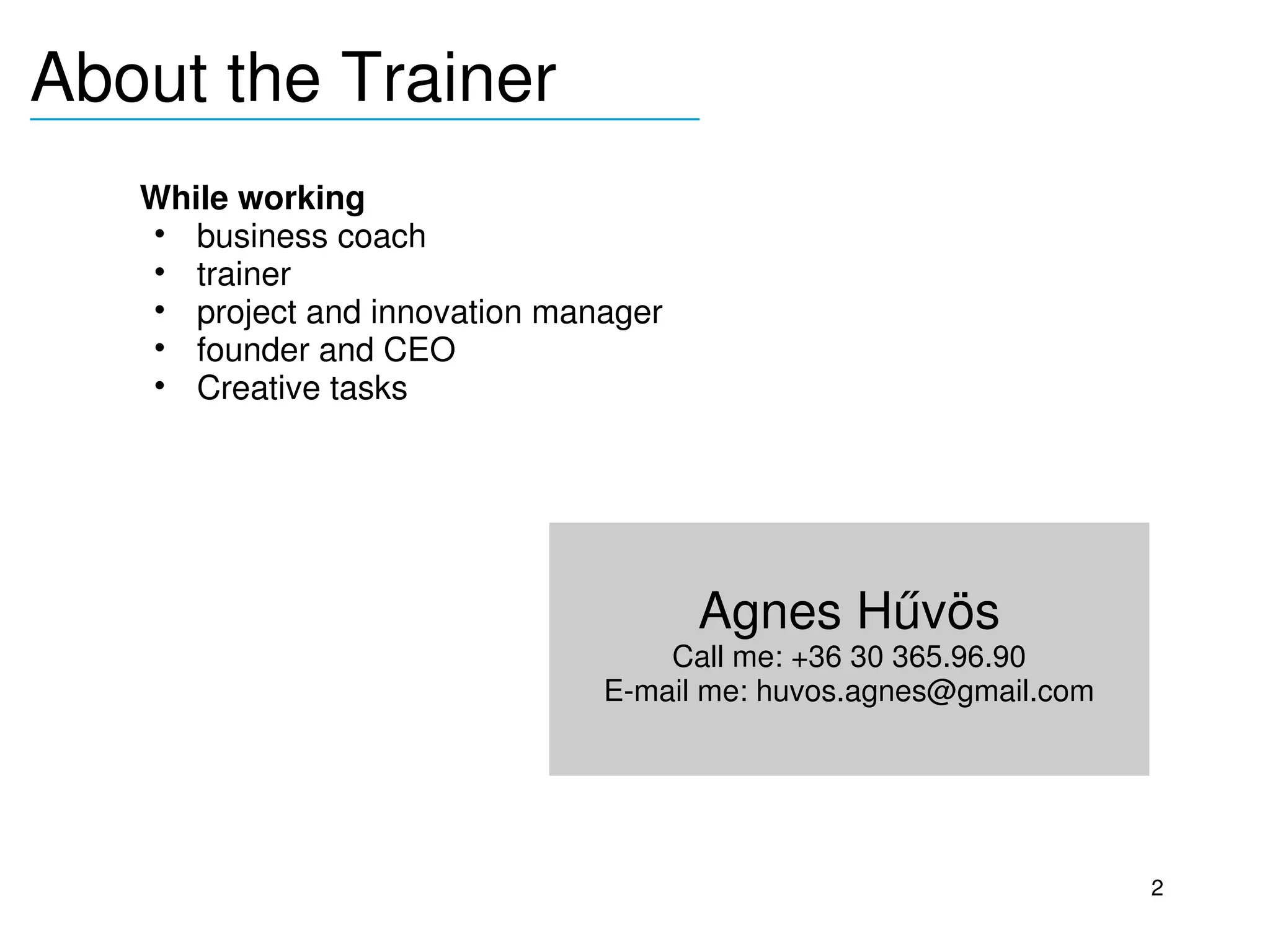 The document outlines a business coaching training session led by Agnes Hűvös, focusing on entrepreneurship education, coaching techniques, and negotiation strategies within the R&D and innovation sectors. It covers various coaching models such as the GROW model, the RAMM model, and the 7C model, alongside methods for effective negotiation and decision-making. The training emphasizes the importance of open-ended questions and understanding clients' needs and pain points in various business contexts.