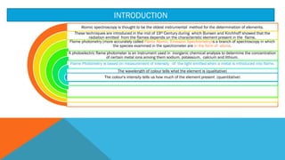 Flame photometry is a technique that uses the characteristic emissions of light from atoms excited in a flame to detect the presence of certain metal ions. When a sample containing metal ions is introduced into a flame, the metal ions are atomized and excited. As they return to lower energy states, they emit light of characteristic wavelengths. A photodetector measures the intensity of emitted light, which corresponds to the concentration of the metal ion in the original sample. Flame photometry is useful for quantitative analysis of metals like sodium, potassium, lithium, and calcium in applications such as clinical analysis of body fluids and agricultural soil testing.