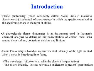 Flame photometry is a technique that uses the characteristic colors emitted from flames to determine the presence of certain metal ions. When metal salts are aspirated into a flame, the metals are excited and emit light at characteristic wavelengths. The intensity of the emitted light is proportional to the concentration of the metal ion in solution. Common metal ions that can be analyzed using flame photometry include sodium, potassium, lithium, and calcium.