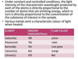 This document presents an introduction to flame photometry. It discusses how flame photometry uses atomic emission spectrometry to determine the concentration of certain metal ions like sodium, potassium, calcium, and lithium when introduced into a flame. The metal ions are volatilized in the flame and their intensity is measured. However, flame photometry has limitations in that only a limited number of elements can be analyzed, samples must be in solution, small sample amounts are difficult to analyze, and other impurities can mix in during solubilization potentially causing errors. References on the topic are also provided.