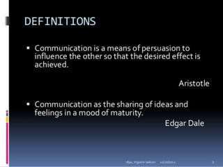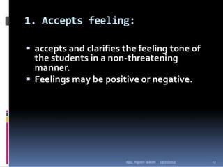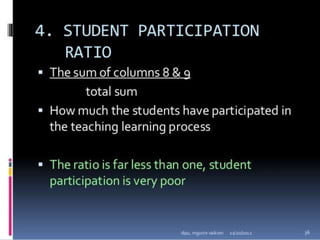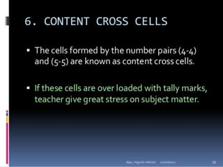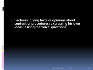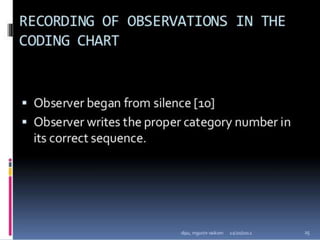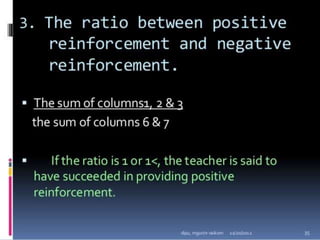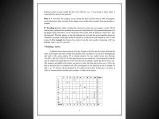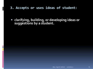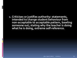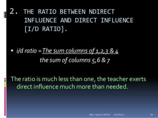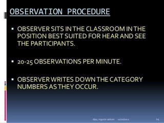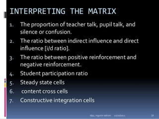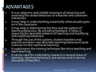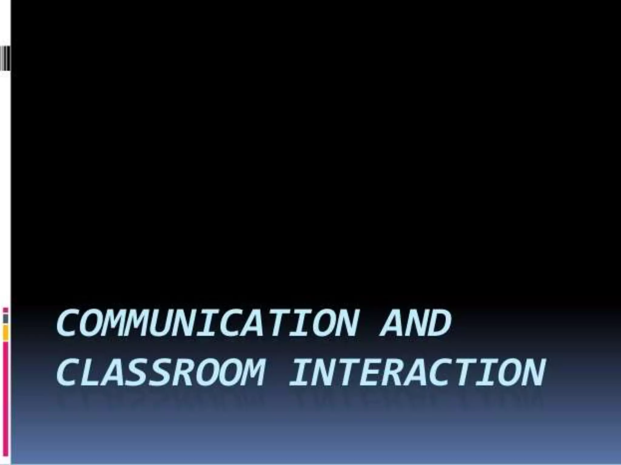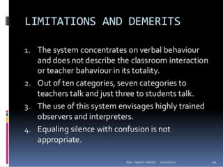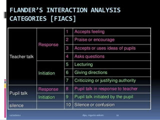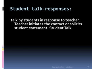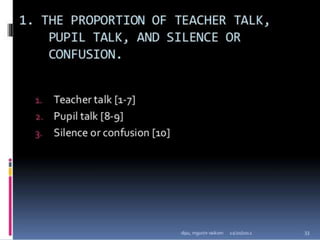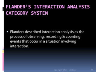 Classroom interaction analysis is a technique used to record and analyze verbal and nonverbal interaction between teachers and students during lessons. It can capture both quantitative and qualitative aspects of a teacher's communication behavior. Classroom interaction is divided into two parts - verbal interaction, which can be direct or indirect, and student talk or silence, and nonverbal interaction. The analysis provides a way to study how teachers and students communicate in the classroom.