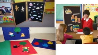 The document discusses flannel boards, which are visual display aids used for storytelling. A flannel board consists of a rigid surface covered with flannel or felt fabric that allows pictures and cards to be attached by gentle pressure. Flannel boards are used in education to convey ideas in an engaging way and add variety to classroom activities. They allow teachers to build up ideas step-by-step and provide information to students in an appealing manner. Flannel boards have advantages like being inexpensive and holding students' attention but require advance preparation and artistic ability to use effectively.