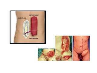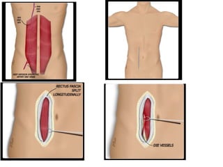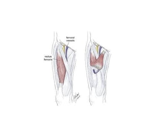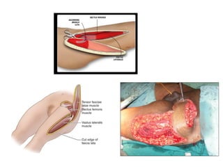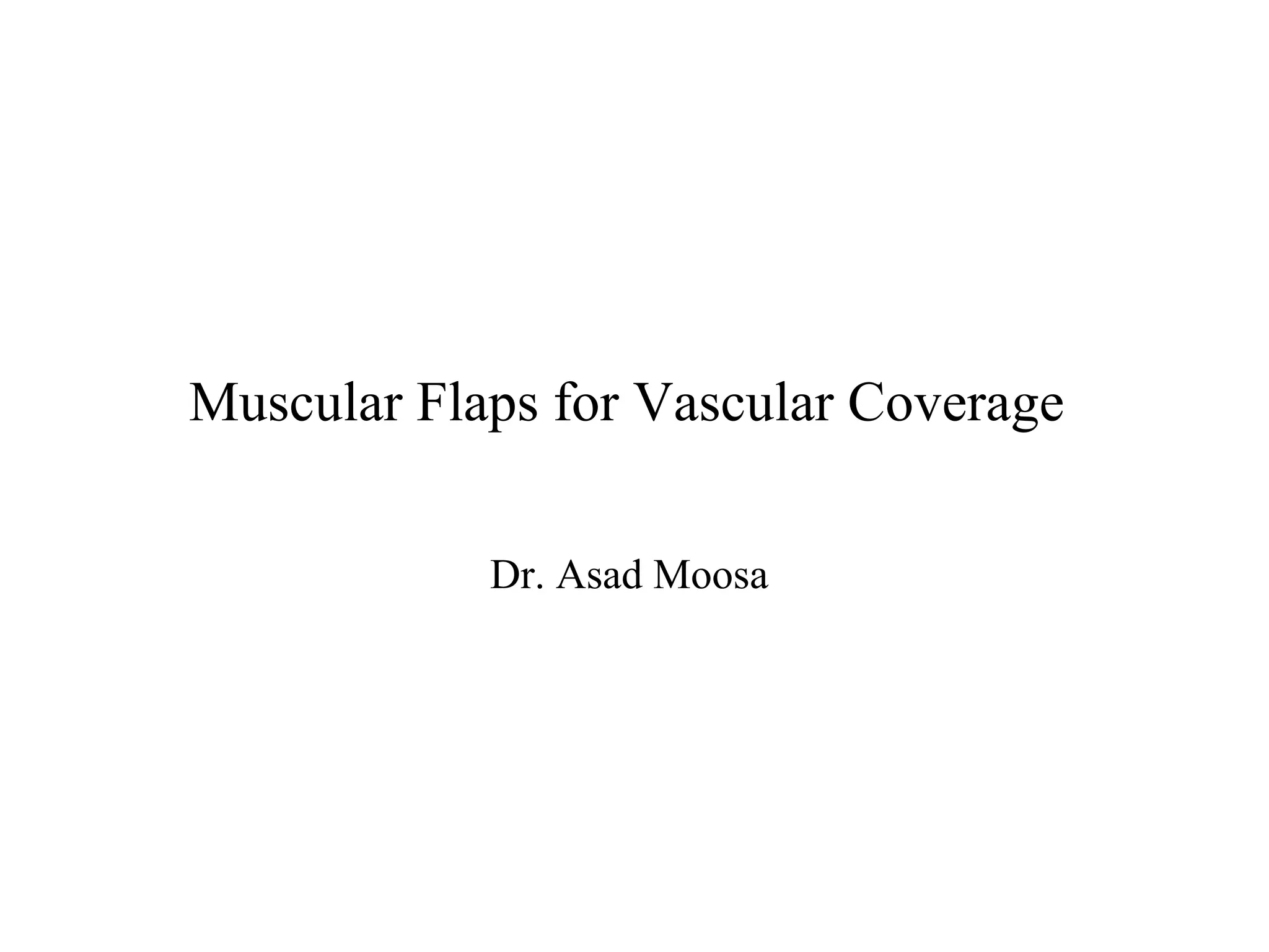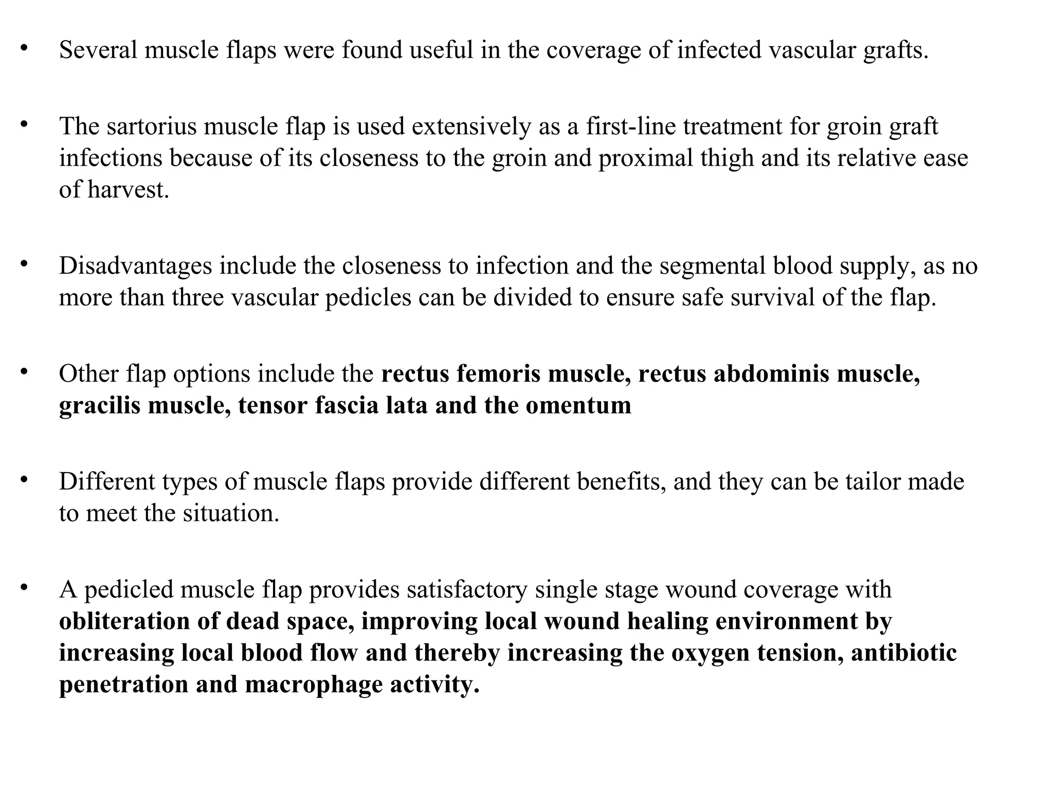 The document discusses several muscle flaps that can be used for coverage of infected vascular grafts, including the sartorius, gracilis, rectus femoris, tensor fascia lata, and rectus abdominis muscles. It also discusses using the greater omentum. Each option has advantages and disadvantages in terms of blood supply, size, and functional implications. The sartorius is frequently used due to its reliable segmental blood supply and proximity to the groin. The gracilis is suitable for smaller defects while the rectus femoris and tensor fascia lata are good for more extensive coverage.