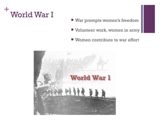 During the 1920s, women gained new freedoms and roles in society. World War I gave women new responsibilities on the home front and working outside the home. The passage of the 19th amendment in 1920 granted women the right to vote. This empowered women and led to more holding political offices and jobs in various fields like teaching, nursing, and social work. The 1920s saw the rise of the flapper, as young women embraced a more independent and fun-loving lifestyle through fashion and behavior. However, conservative values still conflicted with this new social freedom for women.