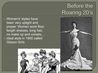 Women's fashion and lifestyles changed dramatically in the 1920s as a result of social and cultural shifts after World War 1. Young women, called "flappers", rebelled against traditional values by smoking, drinking, wearing revealing clothes like short dresses and no corsets, and dancing provocatively. Flappers cut their hair short, wore makeup, and sought independence, freedom of expression, and sexual liberation not seen in prior generations of women. Their unconventional behavior represented the social revolution of the Roaring Twenties era in America.