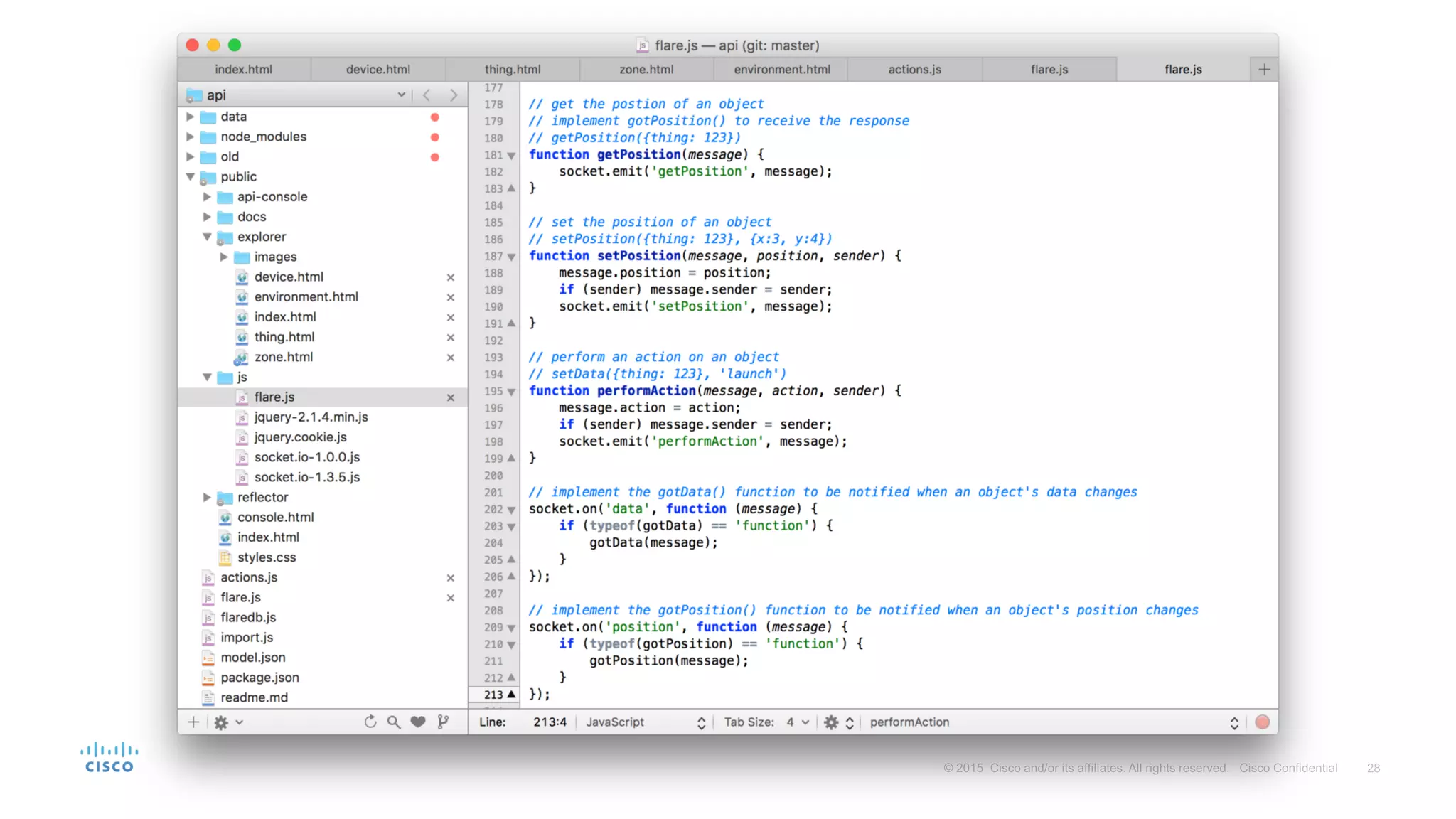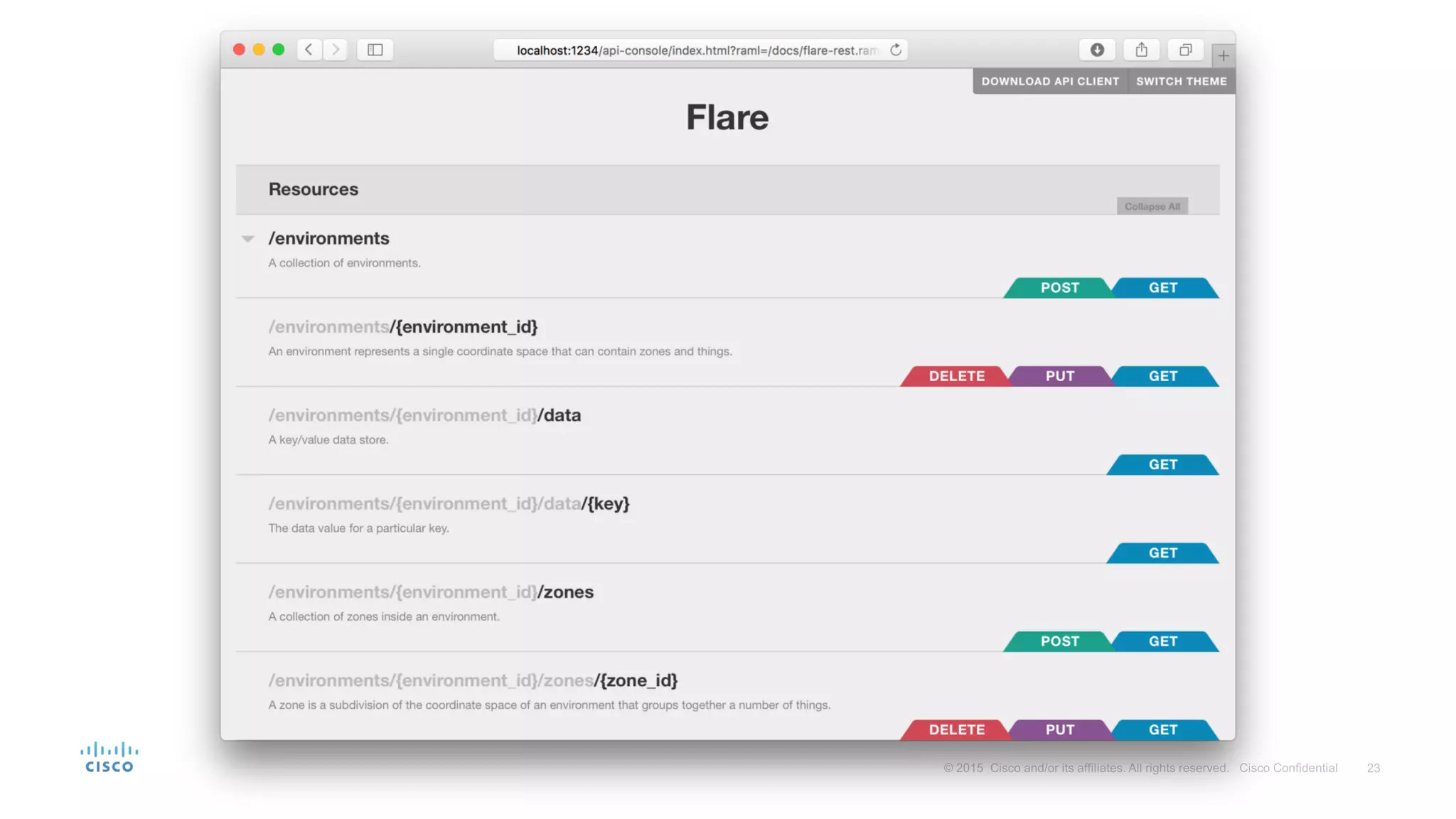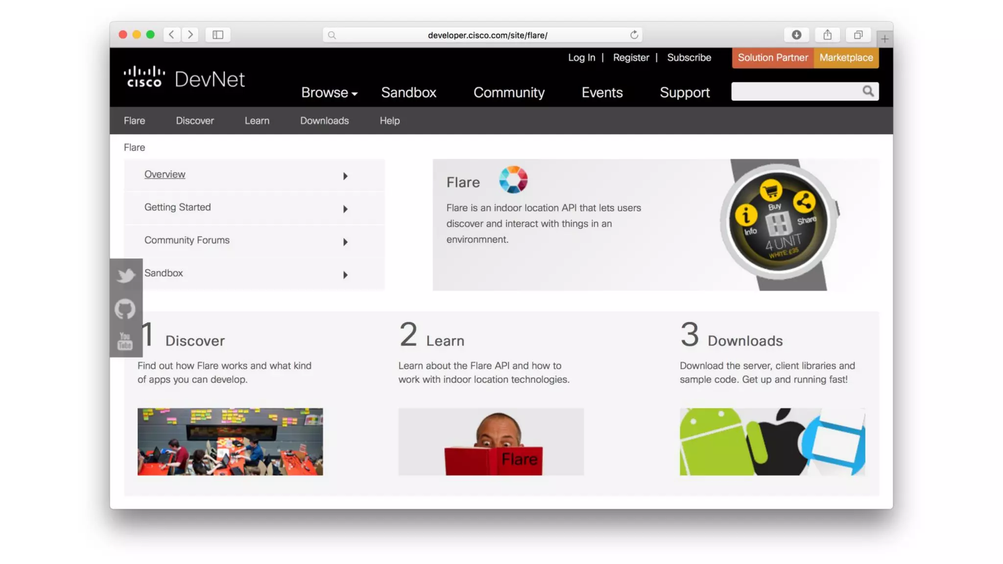 Flare is a mobile solution by Cisco that enables users to interact with their environment using various location technologies and real-time communication. It allows devices to discover nearby objects and interact with them, with potential applications in retail, museums, and public transport. The technology is open-source, implemented in Node.js and MongoDB, and can integrate with Bluetooth beacons and Wi-Fi, making it adaptable for various sensor types.