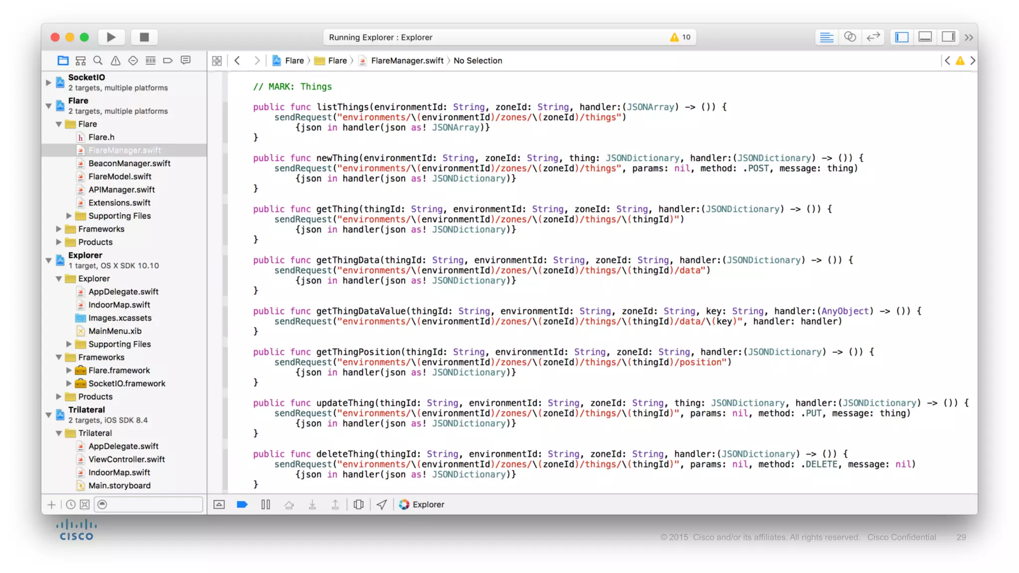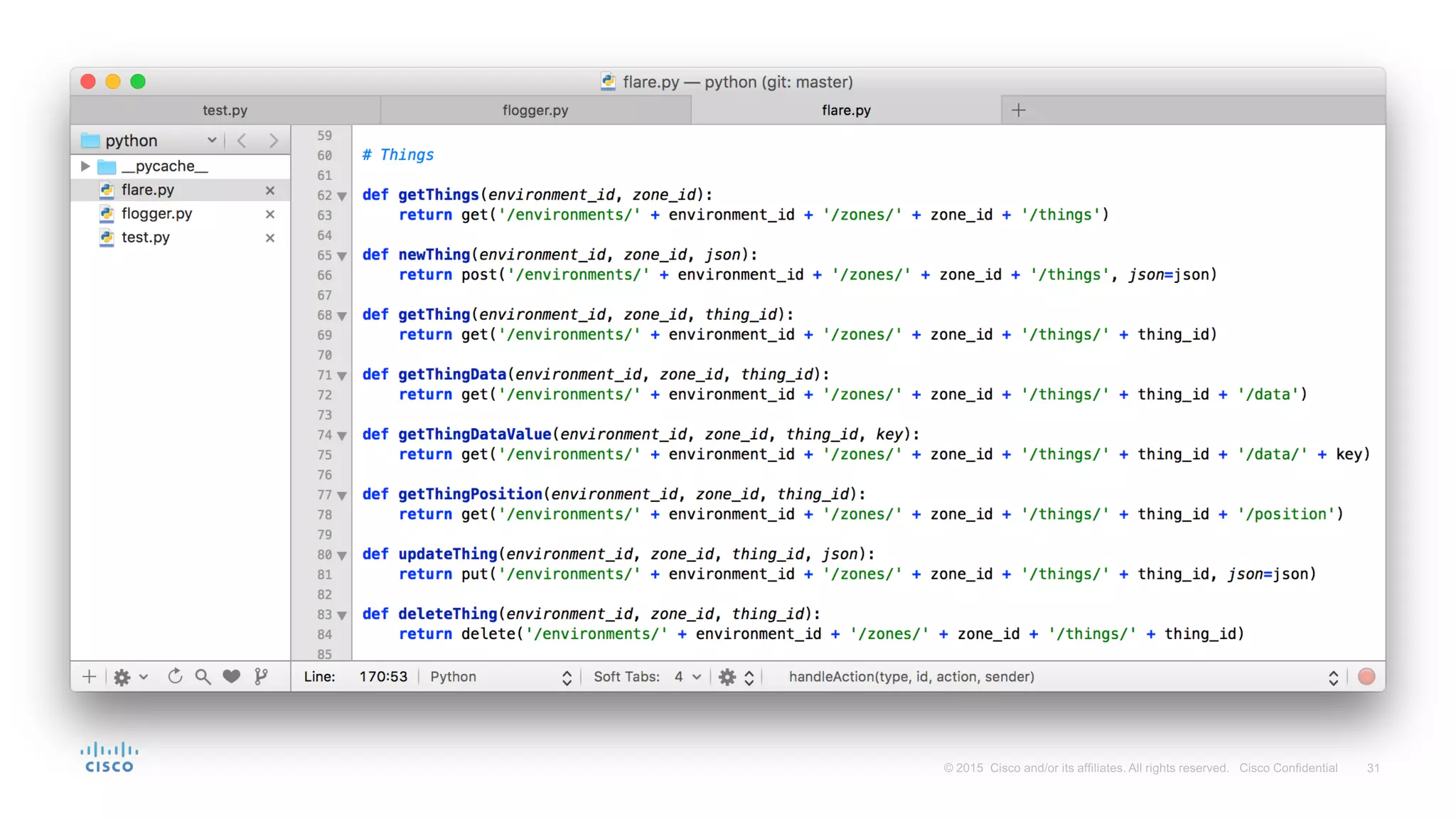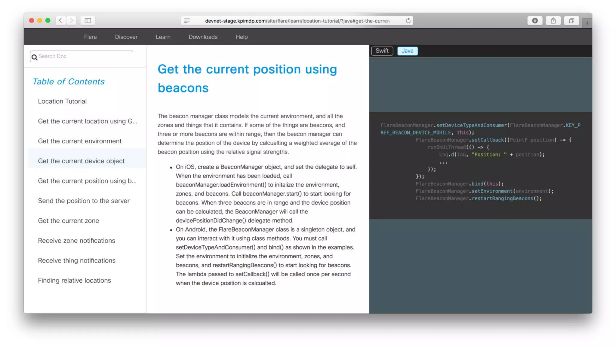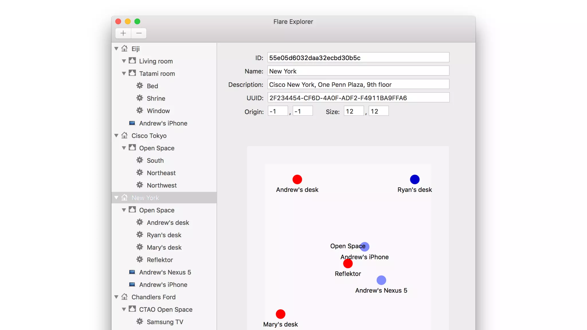 Flare is a mobile solution by Cisco that enables users to interact with their environment using various location technologies and real-time communication. It allows devices to discover nearby objects and interact with them, with potential applications in retail, museums, and public transport. The technology is open-source, implemented in Node.js and MongoDB, and can integrate with Bluetooth beacons and Wi-Fi, making it adaptable for various sensor types.