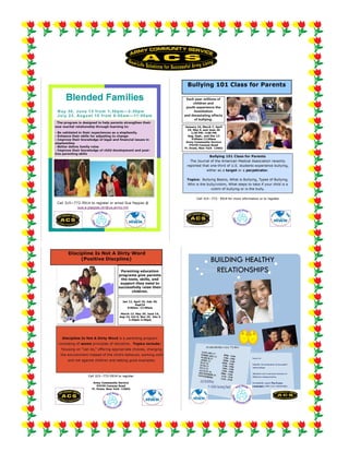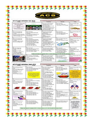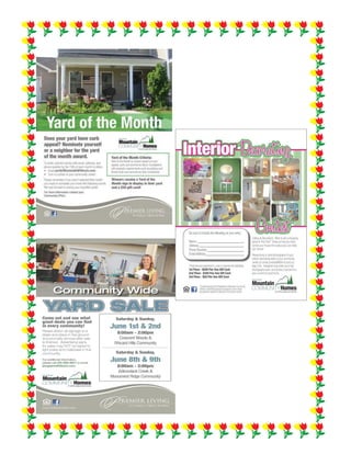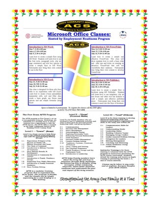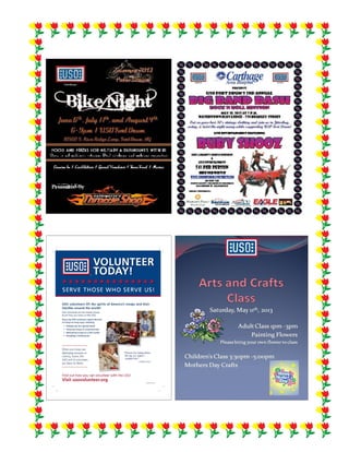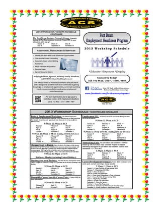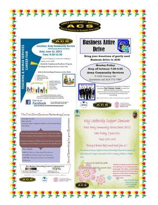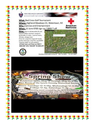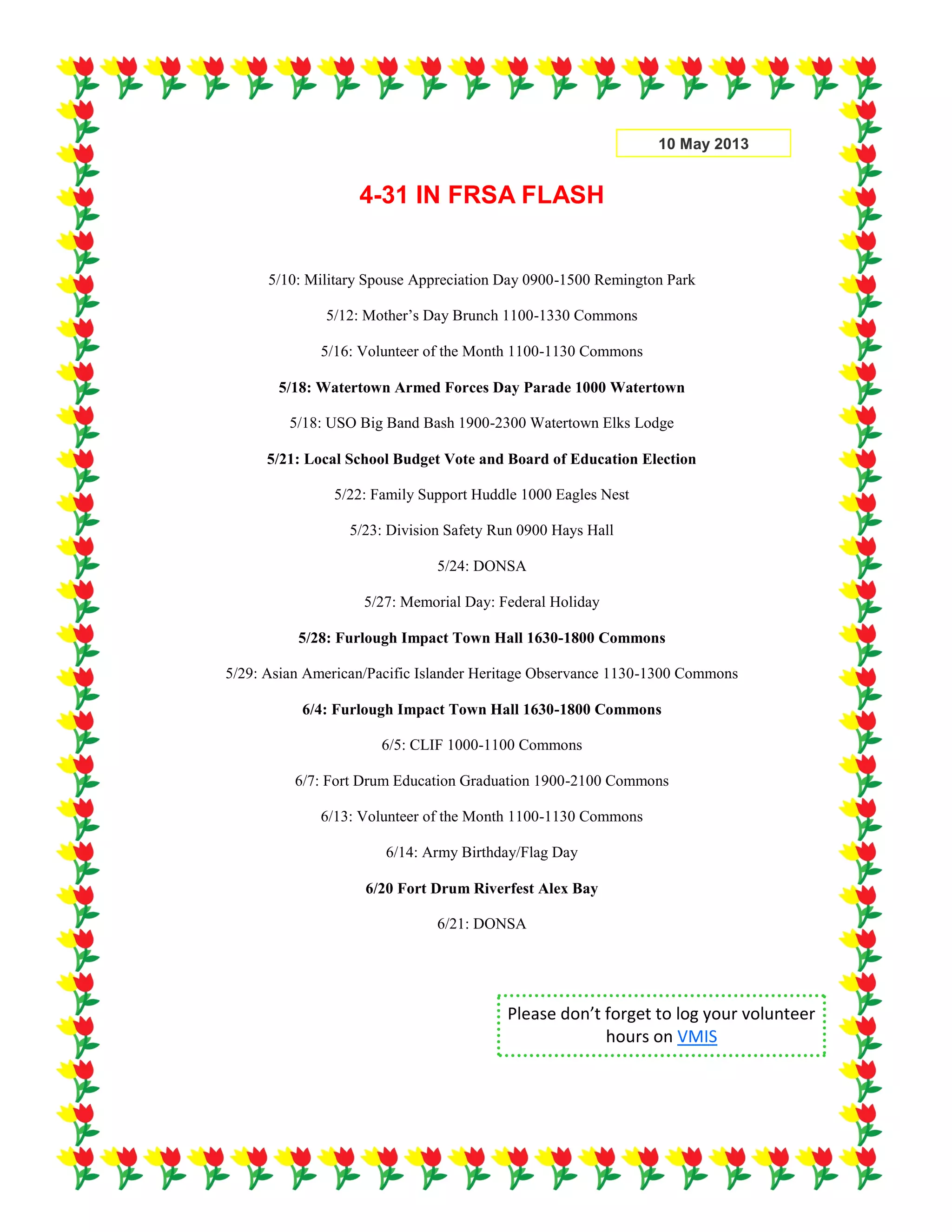 The document lists various events taking place at Fort Drum in May and June, including a military spouse appreciation day, Mother's Day brunch, volunteer of the month recognitions, Armed Forces Day parade, USO big band bash, school budget votes, family support huddles, a safety run, Asian American/Pacific Islander heritage observance, furlough impact town halls, a CLIF training, education graduation, Army birthday/Flag day, Riverfest, and dates for DONSA and volunteer hour logging. It also provides information on taking an online food handler's course and ammunition amnesty day.