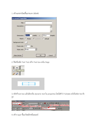 ใช้เครื่องมือ Text Tool สร้าง Text box ลงใน Stage 3. คลิกที่ text box แล้วเลือกเป็น dynamic text ใน properties โดยใส่คาว่า fulldate ลงไปในช่อง Var ดัง รูป 4. สร้าง layer ขึ้นมาใหม่อีกหนึ่งเลเยอร์