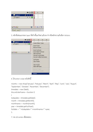 ที่สร้างขึ้นมาใหม่ แล้วกด F9 หรือคลิกขวาแล้วเลือก Actions 6. ใส่ action script ลงไปดังนี้ months = new Array("January", "Febuary", "March", "April", "May", "June", "July", "August", "September", "October", "November", "December"); timedate = new Date(); this.onEnterFrame = function () { todaydate = timedate.getDate(); month = timedate.getMonth(); monthname = months[month]; year = timedate.getFullYear(); fulldate = " "+todaydate+" "+monthname+" "+year; }; 7. กด ctrl+enter เพื่อทดสอบ