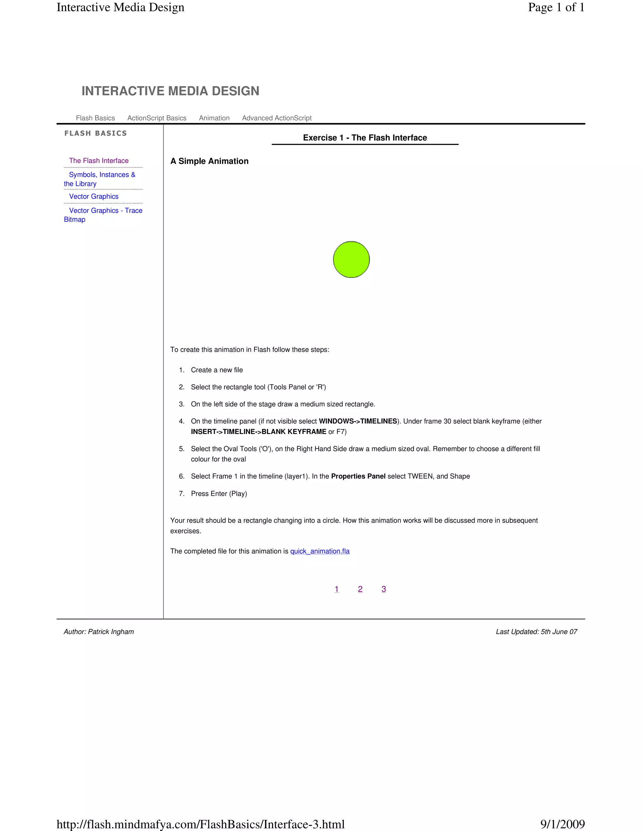 Following these steps creates a simple animation of a rectangle changing into a circle to demonstrate basic Flash animation.