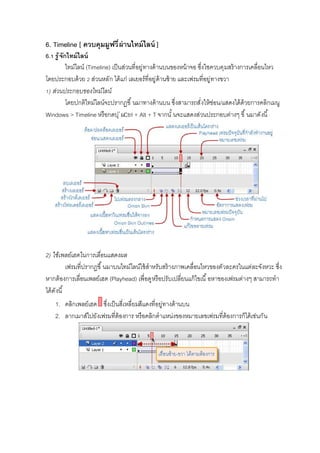 ควบคุมมูฟวีผ่านไทม์ไลน์ ] 6. รู้จักไทม์ไลน์ ไทม์ไลน์ (Timeline) เป็นส่วนทีอยู่ทางด้านบนของหน้าจอ ซึงใชควบคุมสร้างการเคลือนไหว โดยประกอบด้วย ส่วนหลัก ได้แก่ เลเยอร์ทีอยู่ด้านซ้าย และเฟรมทีอยู่ทางขวา ) ส่วนประกอบของไทม์ไลน์ โดยปกติไทม์ไลน์จะปรากฏขึ นมาทางด้านบน ซึงสามารถสังให้ซ่อน/แสดงได้ด้วยการคลิกเมนู Windows > Timeline หรือกดปุ่มCtrl + Alt + T จากนั นจะแสดงส่วนประกอบต่างๆ ขึ นมาดังนี 2) ใช้เพลย์เฮดในการเลือนแสดงผล เฟรมทีปรากฏขึ นมาบนไทม์ไลน์ใช้สําหรับสร้างภาพเคลือนไหวของตัวละครในแต่ละจังหวะ ซึง หากต้องการเลือนเพลย์เฮด (Playhead) เพือดูหรือปรับเปลียนแก้ไขเนื อหาของเฟรมต่างๆ สามารถทํา ได้ดังนี 1. คลิกเพลย์เฮด ซึงเป็นสีเหลียมสีแดงทีอยู่ทางด้านบน 2. ลากเมาส์ไปยังเฟรมทีต้องการ หรือคลิกตําแหน่งของหมายเลขเฟรมทีต้องการก็ได้เช่นกัน