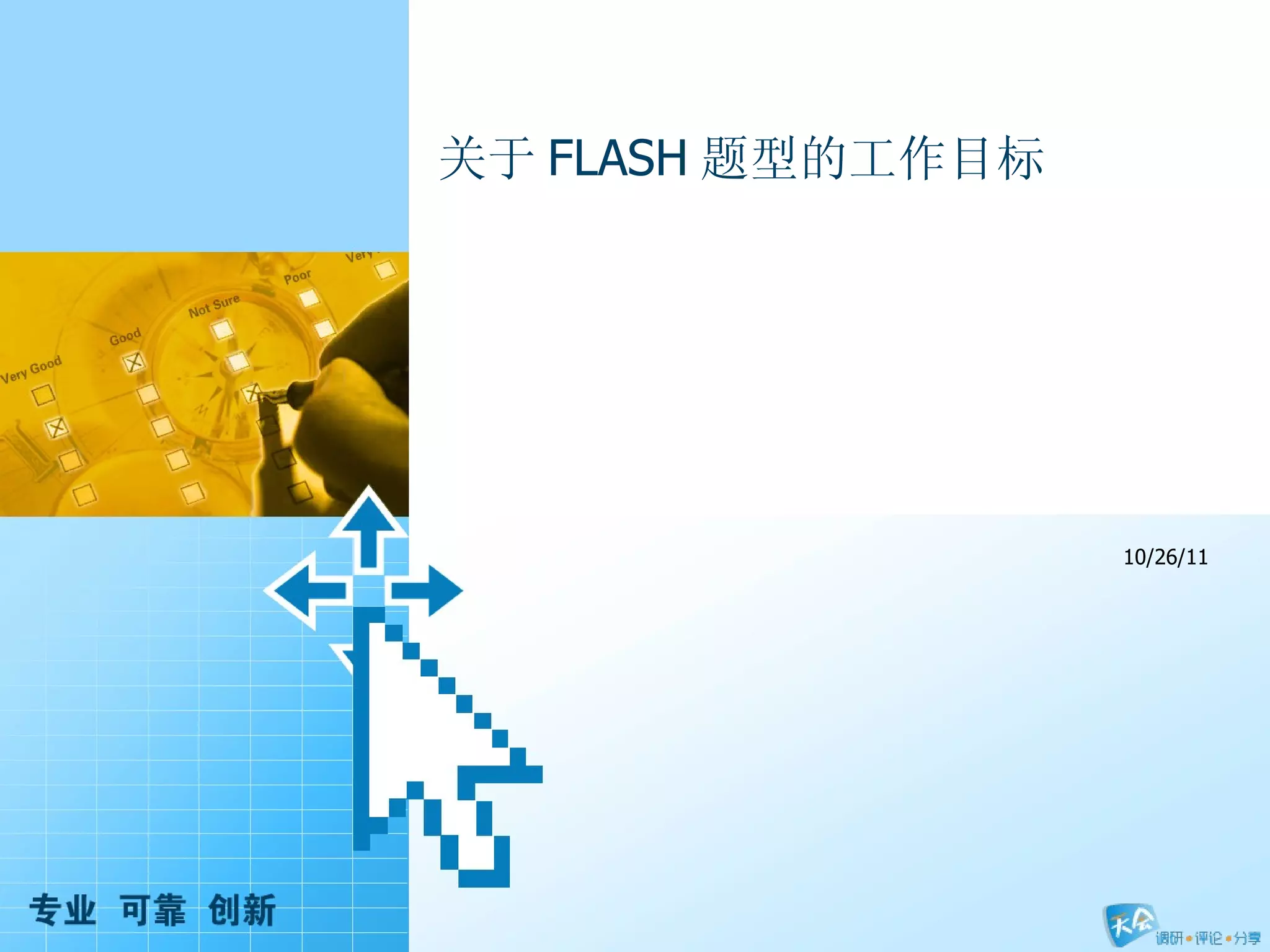 文档讨论了引入 flash 题型到调研宝题库的目标,以提升用户体验和满足客户需求。强调通过 flex/flash 的优势来开发新题型,并建立完善的筛选机制以丰富题库表现形式。新题型的创意将依赖客户需求、团队协作和数据分析。