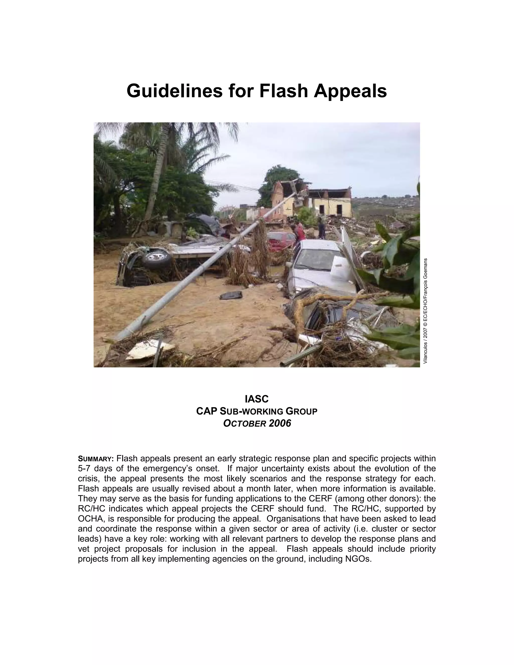 Flash appeals present an early strategic response plan and specific projects within 5-7 days of the emergency’s onset. If major uncertainty exists about the evolution of the crisis, the appeal presents the most likely scenarios and the response strategy for each. Flash appeals are usually revised about a month later, when more information is available. They may serve as the basis for funding applications to the CERF (among other donors): the RC/HC indicates which appeal projects the CERF should fund. The RC/HC, supported by OCHA, is responsible for producing the appeal. Organisations that have been asked to lead and coordinate the response within a given sector or area of activity (i.e. cluster or sector leads) have