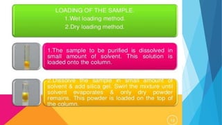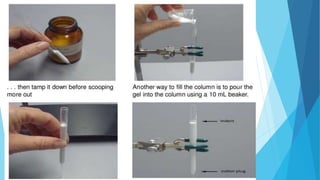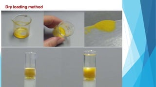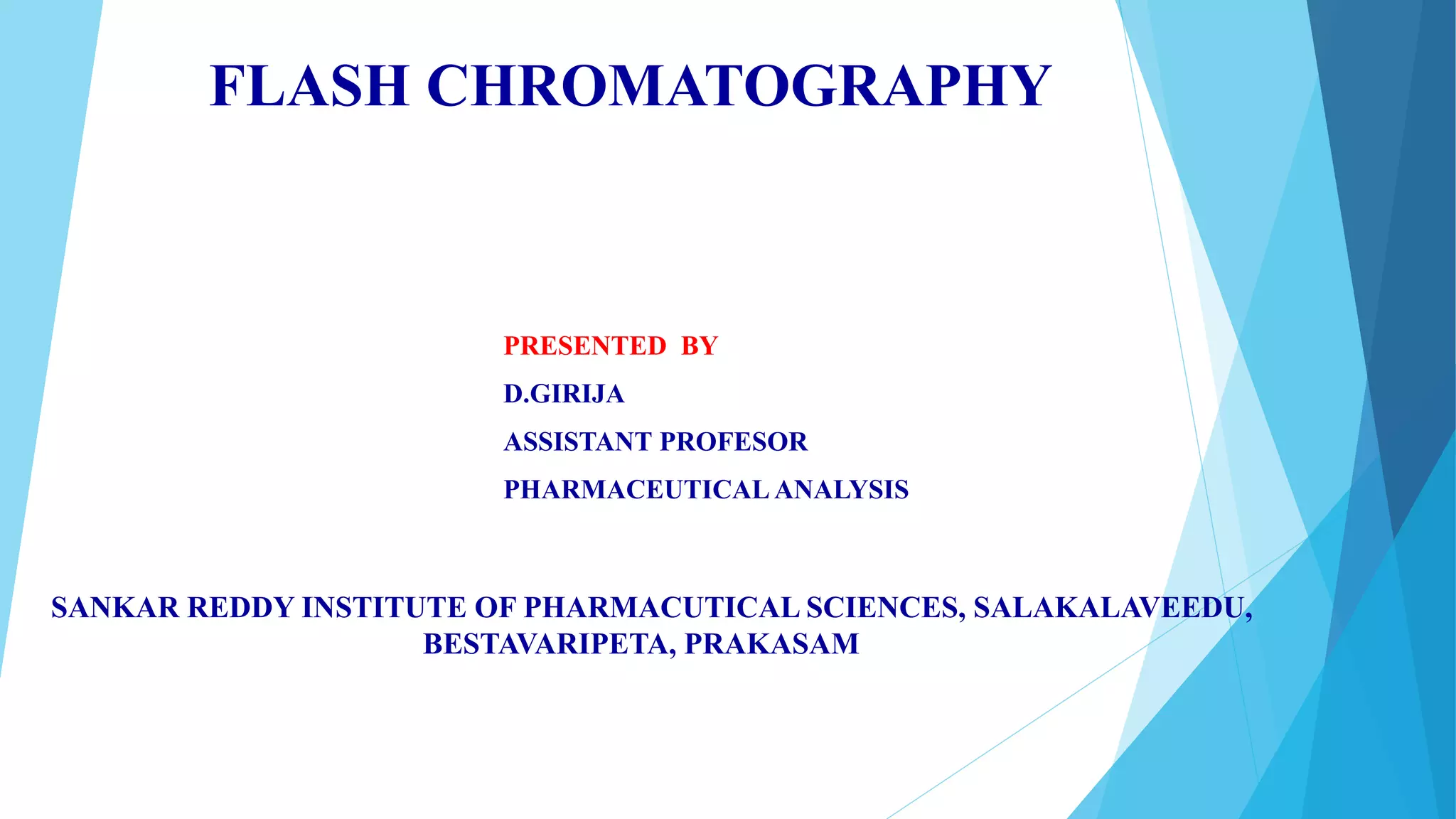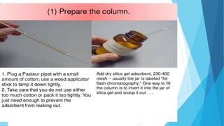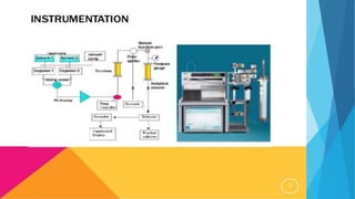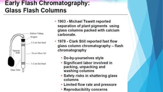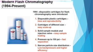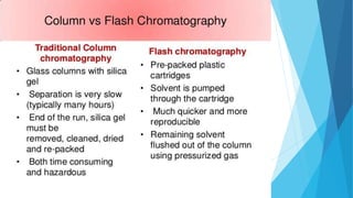 Flash chromatography is a technique that uses compressed gas to rapidly push solvent through a column packed with adsorbent material like silica gel. This allows for faster separations compared to traditional gravity chromatography. The document discusses the principles, common solvent systems, packing columns, instrumentation used like pumps, fraction collectors, and detectors, and applications of flash chromatography.